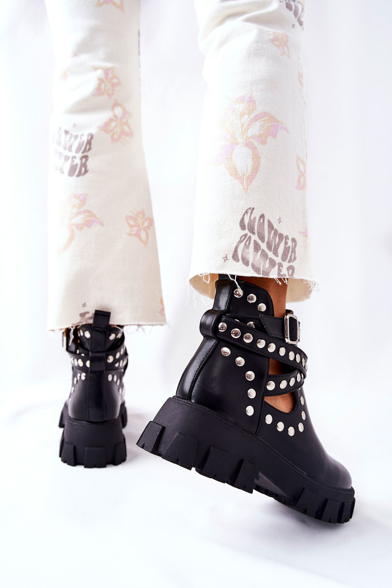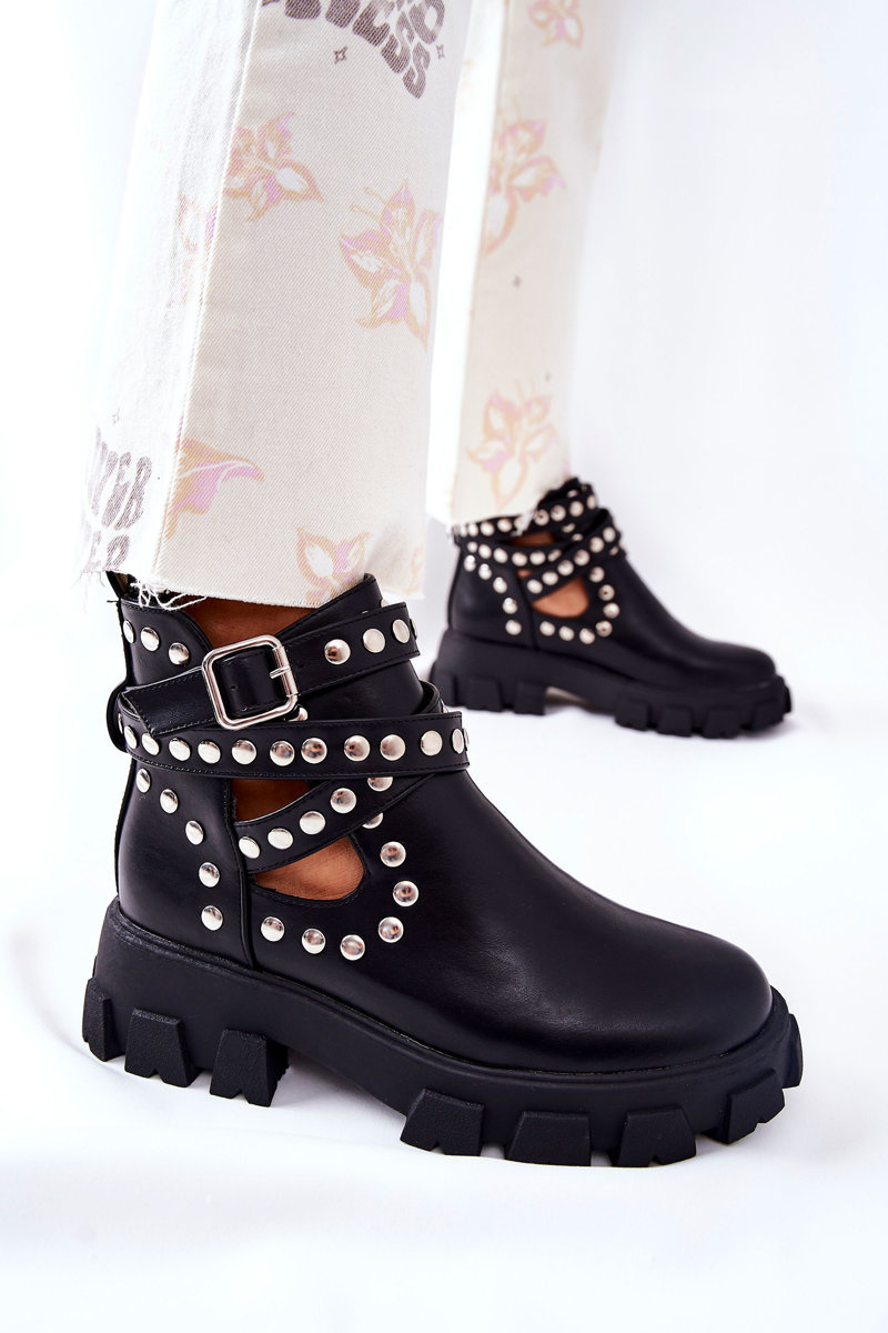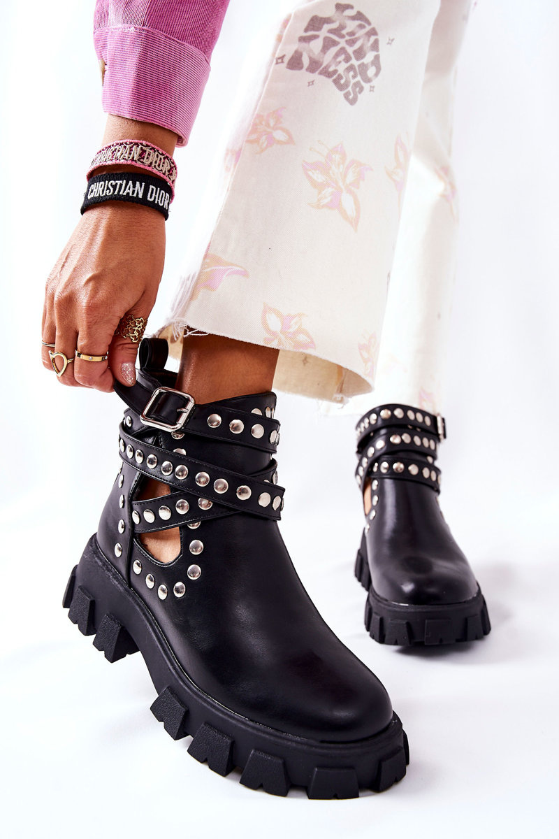 Верх чобіт виготовлений з екологічної шкіри, а внутрішня частина обшита текстилем. Черевики слипони. Мають пряжку з регульованим ремінцем. Верх прикрашений стразами, а по всьому верху є ефектні вирізи. Перегляньте інші наші колекції черевиків! Під час вибору розміру зверніться до таблиці розмірів