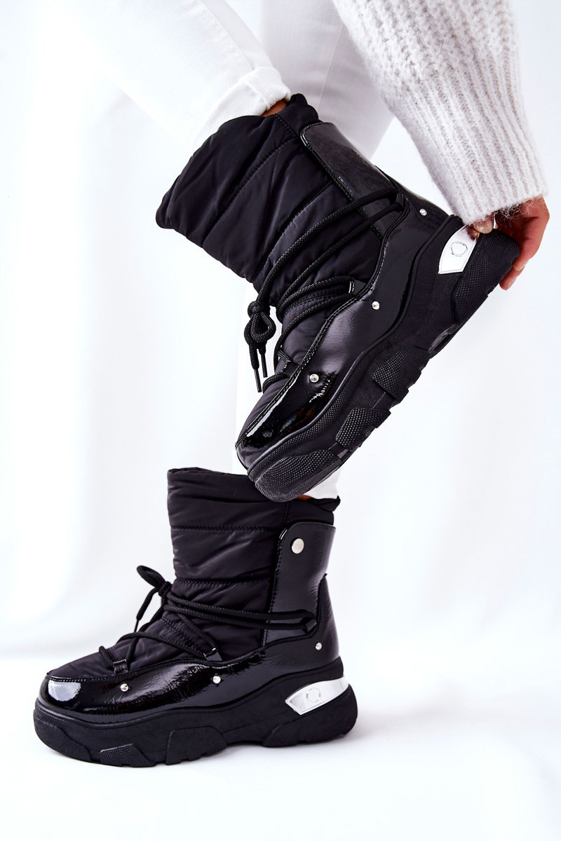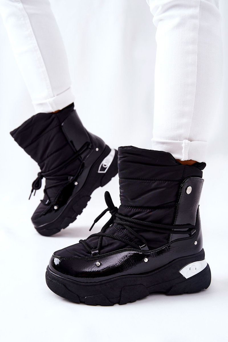 Шукаєте теплі та зручні зимові черевики? Тоді ви знайшли правильне місце! Снігові черевики утеплені приємним на дотик хутром. Зовнішня частина взуття виконана з текстильного матеріалу і лакованої екошкіри. Міцна шнурівка забезпечує ідеальне прилягання до стопи. Висока платформа. Декоративний елемент ззаду на підошві. Вибираючи розмір, дотримуйтеся таблиці розмірів.