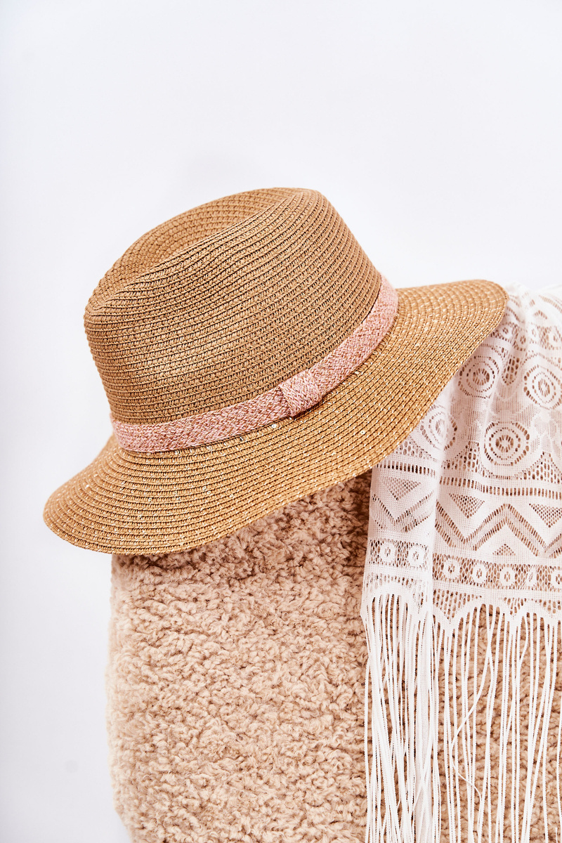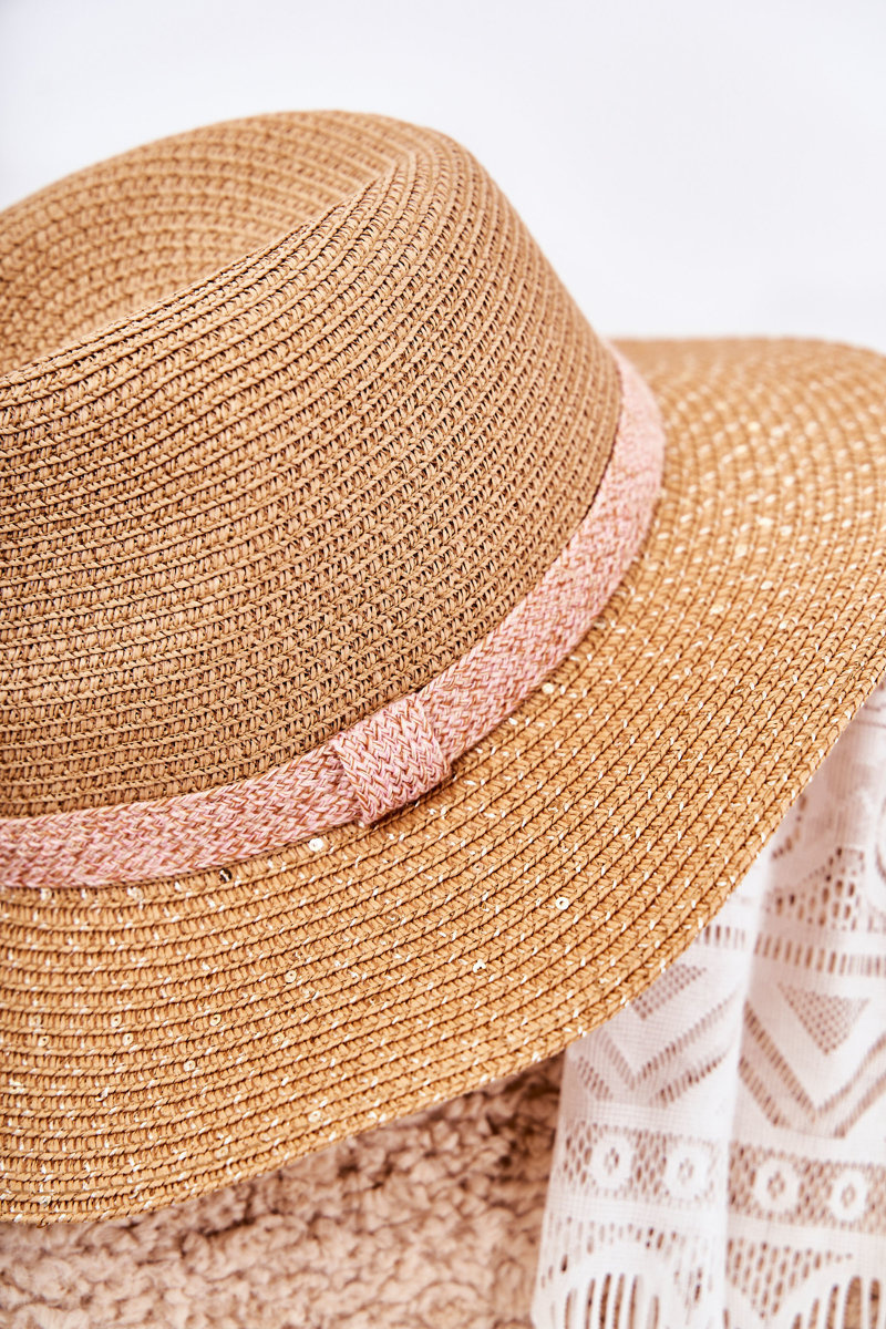 Легкий жіночий капелюшок з паєтками. Капелюх зроблений з плетеного паперу. Край прикрашений рожевою смугою. Всередині є шнурок, який дозволяє регулювати шапку. Обов’язково перегляньте всю нашу колекцію головних уборів! Склад: 82% папір, 12% поліестер, 6% металізоване волокно.