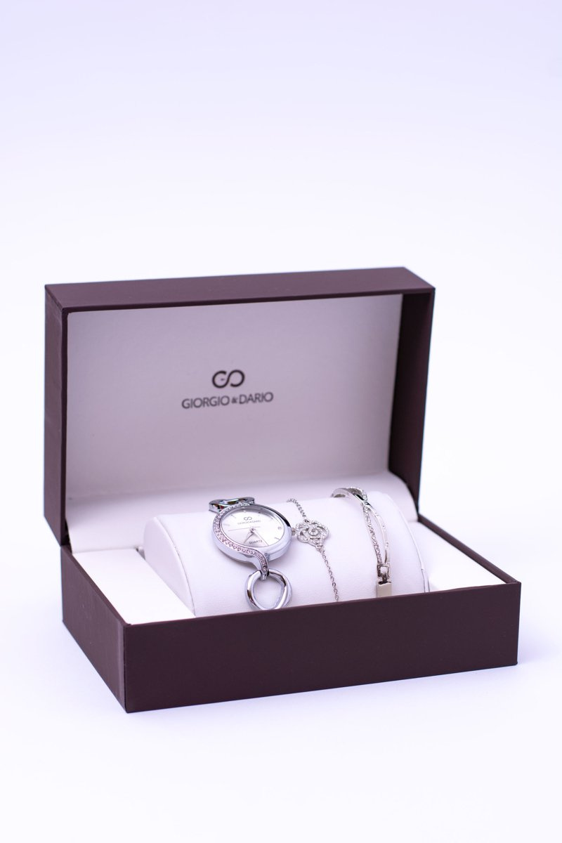 Елегантний і надзвичайно стильний комплект від Giorgio Dario. Срібний годинник, прикрашений крихітними кристалами і двома ніжними браслетами. Цей набір обов'язково вам сподобається, ідеальний набір для подарунка! Пропозиція включає все, що зображено на фото, а саме годинник, два браслети та упаковку.