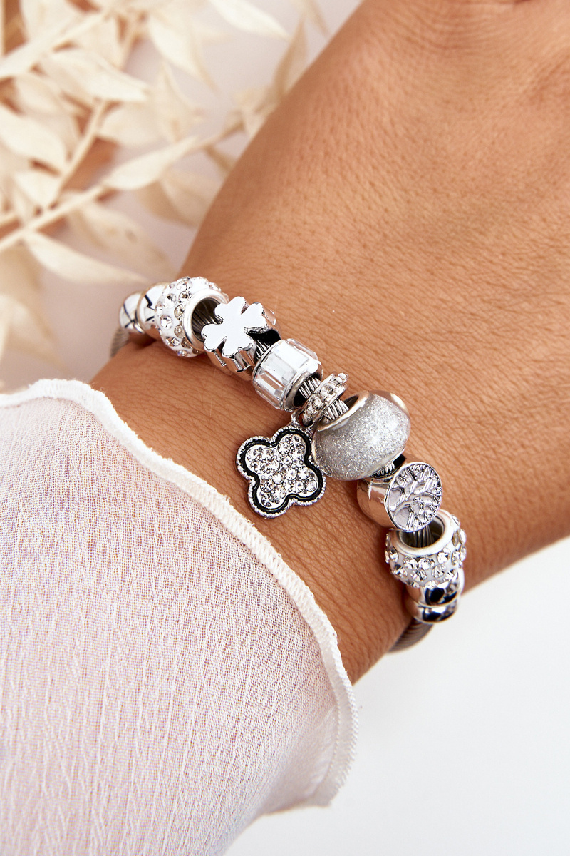 Чудовий, жіночий браслет з нержавіючої сталі. Він має модні шарми, які ідеально доповнюють всю цю модель. Браслет одягається. Це дозволить правильно підлаштуватися під ширину зап’ястя. Крім того, її прикрасили стразами, що імітують стрази. Ви повинні мати це у своїх аксесуарах!