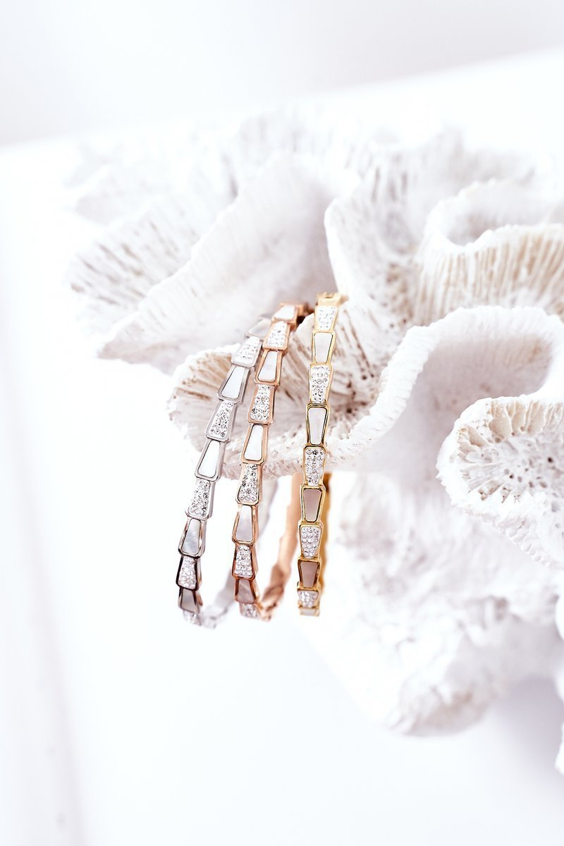 Браслет виготовлений з нержавіючої сталі, прикрашений блискучими фіанітами та камінням з перламутровим покриттям.