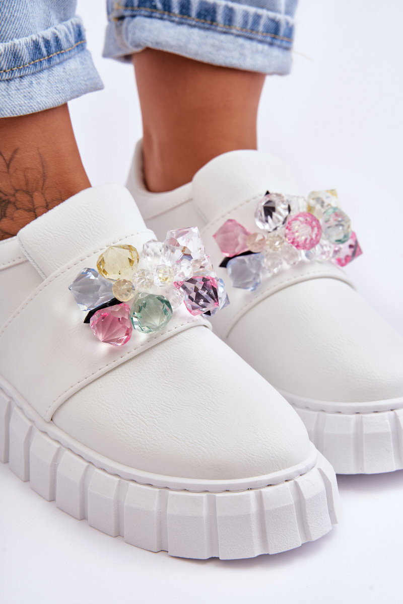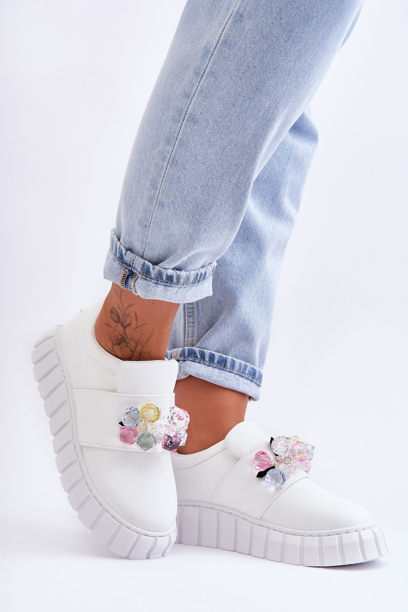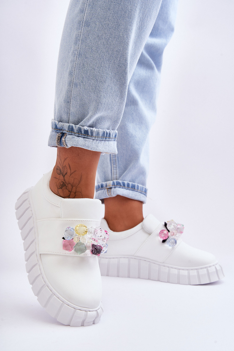 Це унікальне спортивне взуття точно вкраде ваше серце! Виготовлені з еко шкіри. Модель сліпони і додатково має декор спереду у вигляді кристалів. Взуття встановлено на масивну платформу з антиковзкою підошвою. М'яка устілка з поролону і текстилю забезпечить комфортне використання взуття. При виборі розміру орієнтуйтеся на таблицю розмірів.