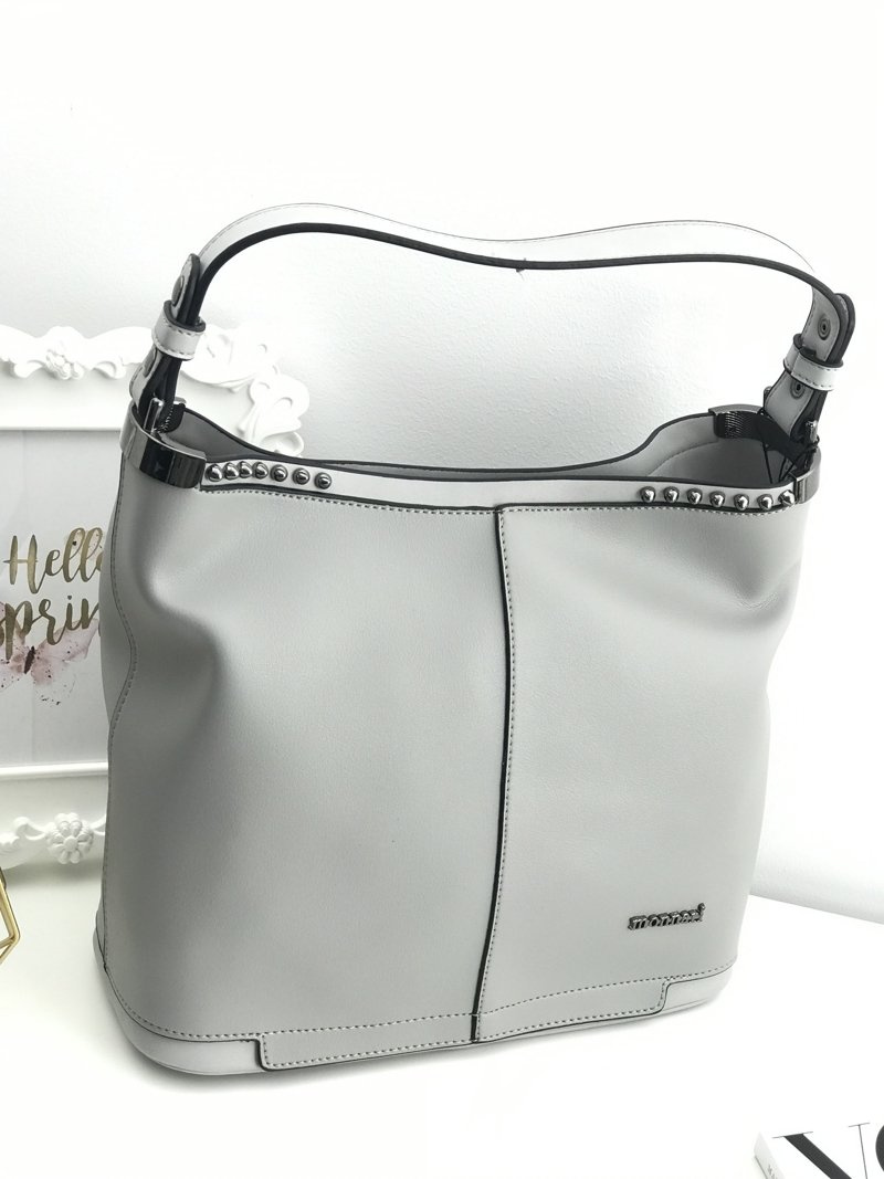 Жіноча сумка-шоппер з екошкіри, середнього розміру, формат А4. Сумка прикрашена блискучими шпильками та металевою фурнітурою. Внутрішня частина сумки з яскравою підкладкою, відкритими відділеннями і кишенею для документів. На задній частині сумки кишеня для телефону. Ми рекомендуємо цю модель як доповнення до вашого міського стилю.