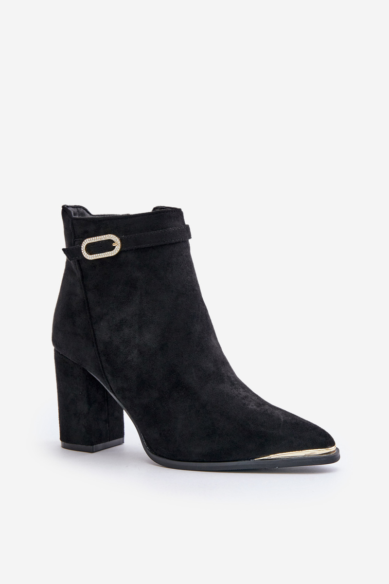 Жіночі ботильйони з приємної на дотик еко замші. Встановіть на каблук. Застібається на блискавку. Загострені пальці візуально подовжують ноги. Посилена п'ята підвищує стійкість стопи. Внутрішня частина утеплена взуттєвим флісом, щоб забезпечити тепло в прохолодні дні. Ця модель виділяється золотистими елементами, які додають елегантності! Обираючи розмір, орієнтуйтеся на таблицю розмірів.