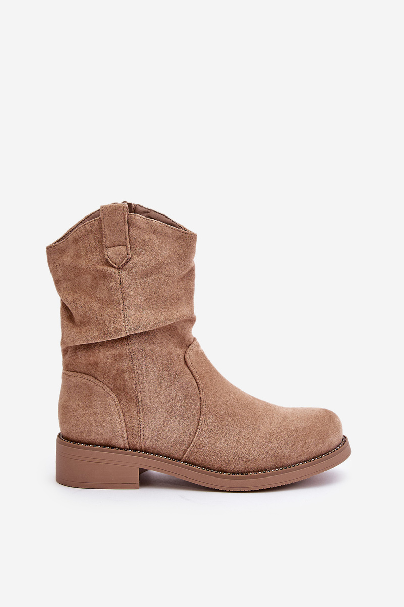 Жіночі ботильйони з еко замші. Комплект на плоскій каблуці. Застібаються на блискавку, що полегшує їх надягання та забезпечує ідеальну посадку. Заокруглені пальці. Ця модель має збірку на халяві та тонкі прикраси біля підошви. Обираючи розмір, орієнтуйтеся на таблицю розмірів.