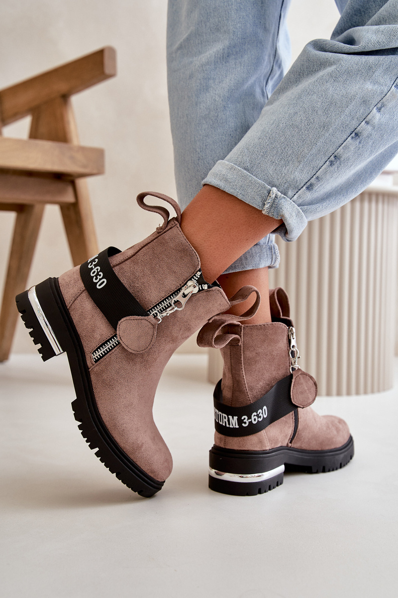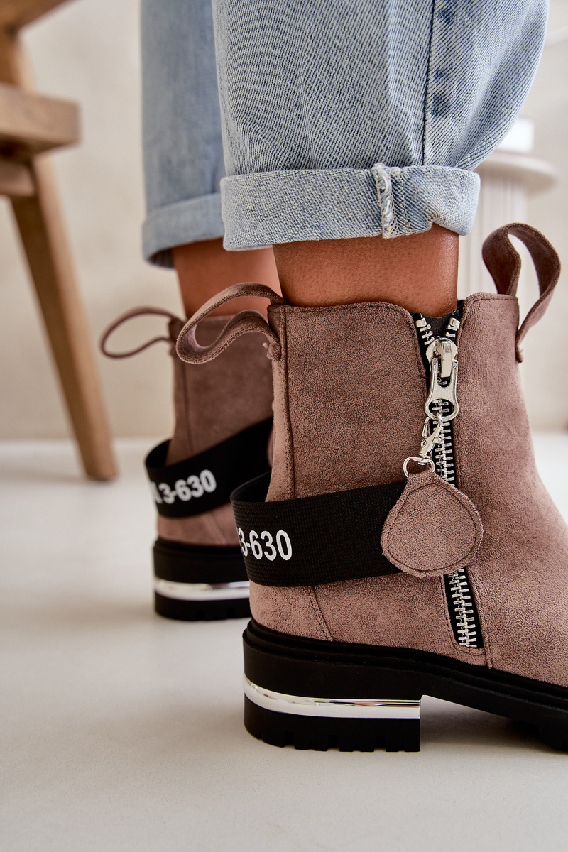 Жіночі ботильйони виготовлені з еко замші. Внутрішня підкладка - м'який, приємний на дотик взуттєвий фліс. Ремінець, що додається до взуття, знімний. Черевики оснащені двома блискавками, одна з яких не знімається. Це взуття на плоскому каблуці з дзеркальною вставкою і рифленою підошвою. Чудова модель для багатьох осінніх образів! Обираючи розмір, орієнтуйтеся на таблицю розмірів.