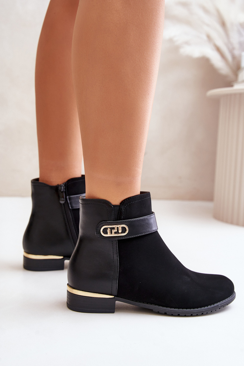 Черевики з еко шкіри. Ідеально підходить для прохолодних днів завдяки термопідкладці. Встановлені на плоску п'яту, вони забезпечують комфорт під час носіння. Є ремінець із золотистими деталями на хвостовику, що додає елегантності. Вам обов’язково їх потрібно мати! Обираючи розмір, орієнтуйтеся на таблицю розмірів.