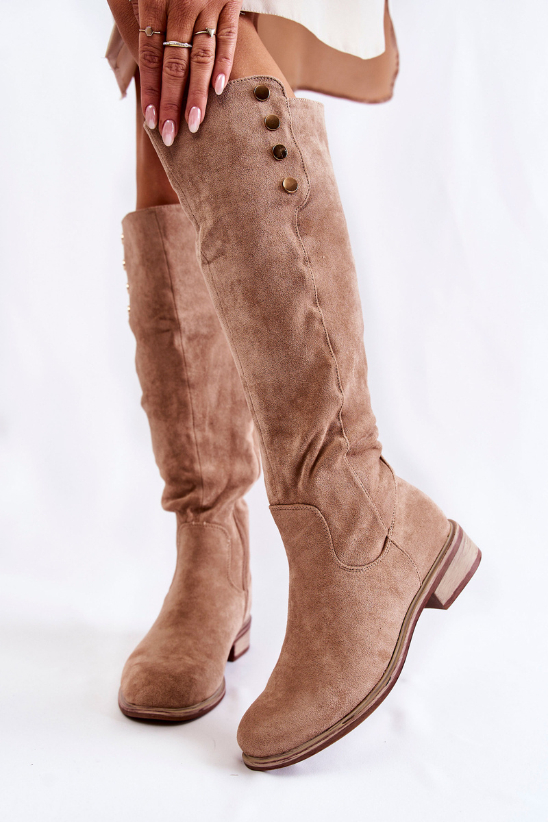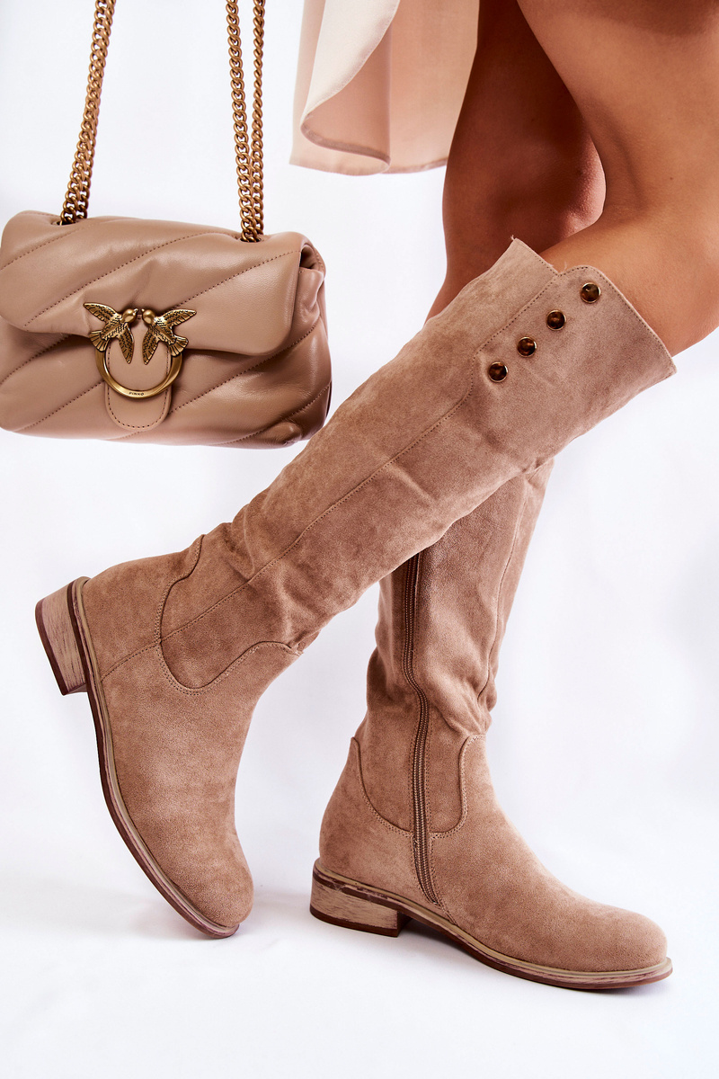 Класичні жіночі чоботи виготовлені з приємної на дотик еко замші. Вони мають неправильну форму верху, прикрашену шпильками у верхній частині. Крім того, п'ятка посилена. Чоботи утеплені всередині ковдрою для взуття. Верх на блискавку по всій довжині. Комплект на плоскій каблуці. Ви напевно будете використовувати їх для багатьох стилів. При виборі розміру скористайтеся таблицею розмірів.