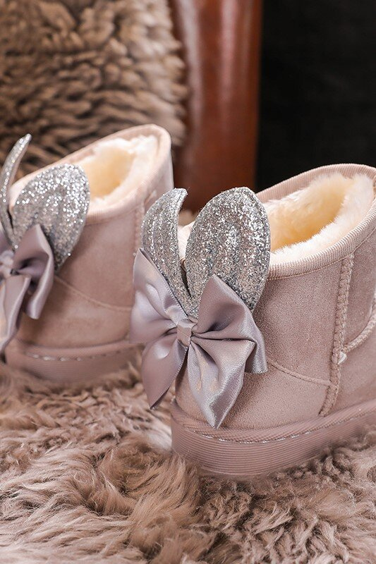 У холодні дні варто подбати про зручне взуття. Ідеальним вибором для зимових розваг стануть милі сніжні чобітки на ніжній платформі. Щільний утеплювач у вигляді м'якого хутра приємно огорне ніжки вашої дитини. Великий бант і блискучі вушка на спині надають їй дуже дівочий характер. Ця модель сподобається вашій дитині! При виборі розміру скористайтеся таблицею розмірів.