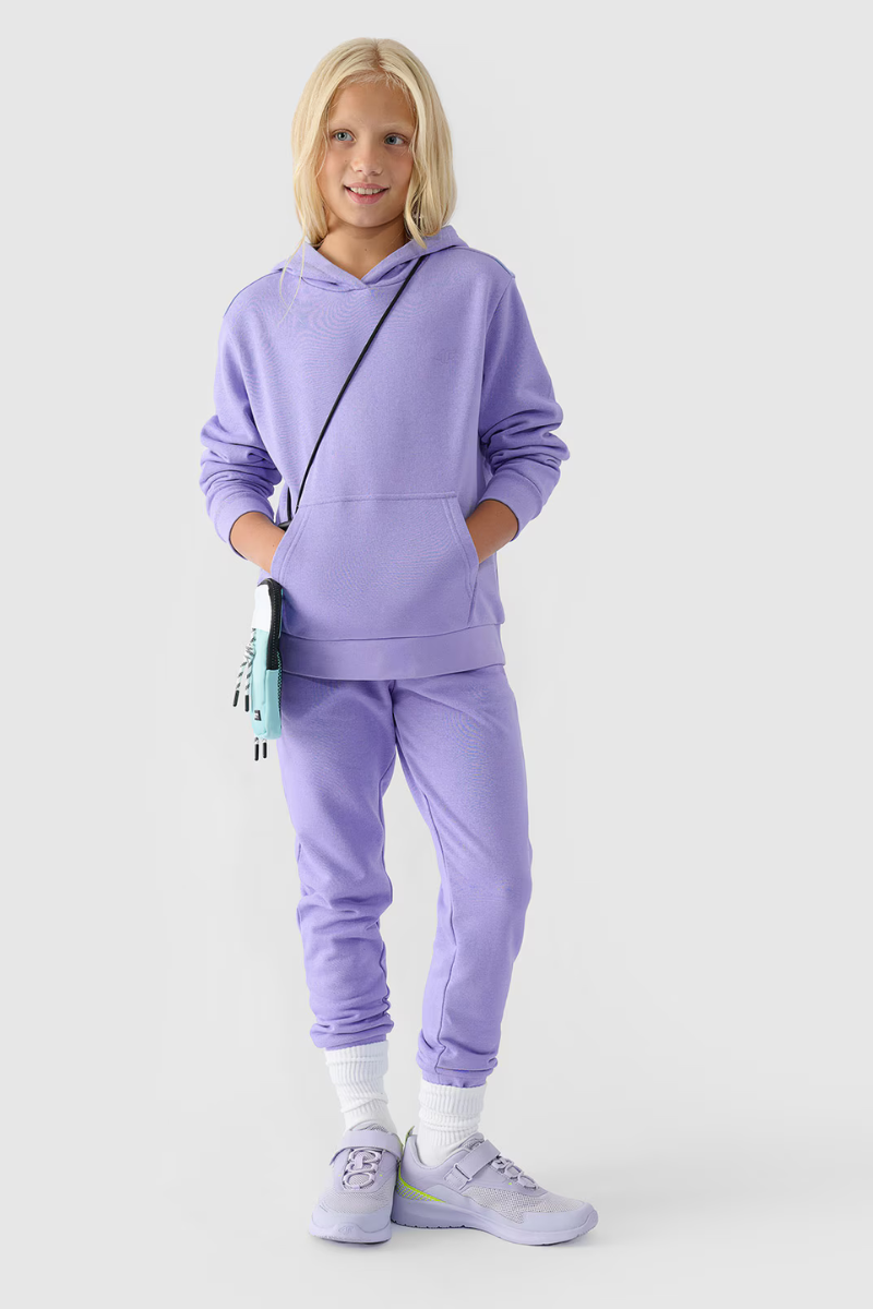 Дівчача толстовка без блискавки з капюшоном ідеально підходить як елемент як для повсякденного, так і для спортивного стилю на кожен день. Має звичайний крій, який зручно адаптується до силуету. Французька махрова тканина гладка з одного боку, а інша сторона має видиму текстуру петлі. Тканина в цьому переплетенні м’яка, більш текуча і тонша на дотик. Толстовка для дівчинки з капюшоном має середню щільність 280 г/м², що робить її м’якою та більш дихаючою. Толстовка для дівчинки без блискавки виготовлена з 80% бавовни, що робить її м'якою, міцною та приємною на дотик. Завдяки додаванню поліестеру (20%) матеріал зберігає форму і стійкий до зношування навіть багато сезонів. Інтегрований капюшон на вирізі. Еластичні манжети зі шнурком. Передня відкрита кишеня кенгуру. Тягне через голову. Низ на широкому шнурку.