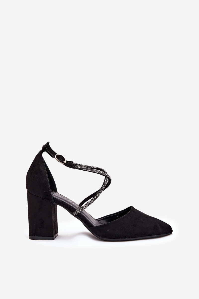 Жіночі туфлі з еко замші. Встановлені на стовпчику. Ця модель вирізняється переплетеними ремінцями, які прикрашені цирконіями, що, безумовно, привернуть увагу та нададуть унікального блиску. Загострені носи підкреслюють їх елегантний вигляд, а застібка на пряжці забезпечує ідеальну посадку. Ці туфлі стануть чудовим вибором для особливих випадків, додаючи кожному образу вишуканості та трохи гламуру. Будь ласка, зверніться до розмірної сітки при виборі розміру.