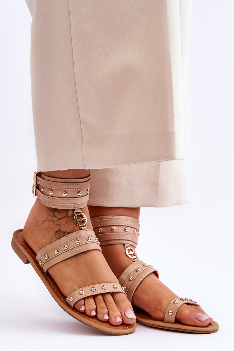 Ця незвичайна модель босоніжок вам точно сподобається! Виготовлені з еко шкіри. Мають прикраси у вигляді шпильок на бретелях. Унікальна модель для кожної жінки, яка цінує стиль і комфорт! Босоніжки застібаються двома регульованими ремінцями з пряжками. Комплект на плоскій каблуці. Вибираючи розмір, зверніться до таблиці розмірів.