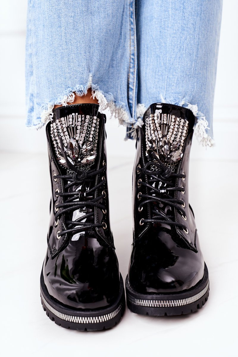 Утеплені черевики з кубічним цирконієм, лакованим чорним. Увага