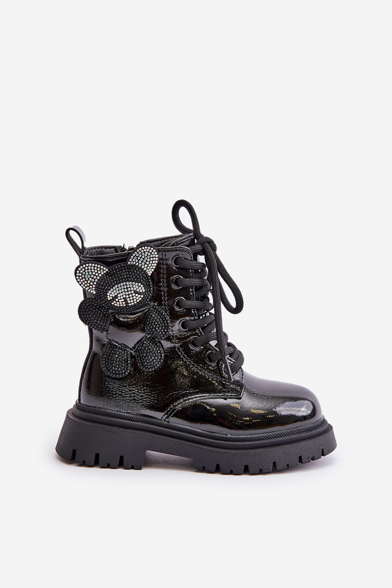 Утеплені чоботи для дівчинки з ведмедиком на блискавці, чорні лаковані Relobia