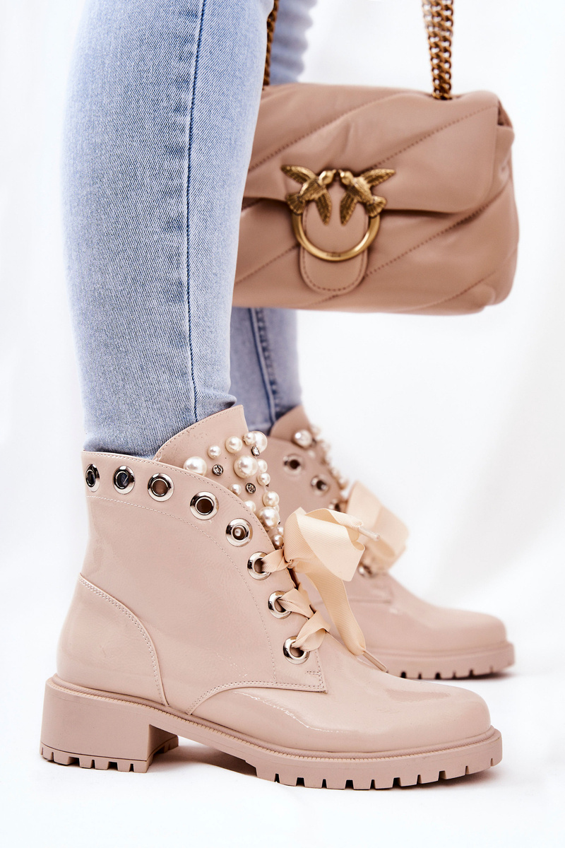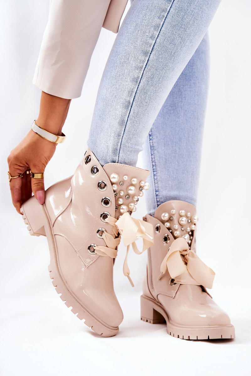 Утеплені чоботи з перлами лаковані бежеві Perla
