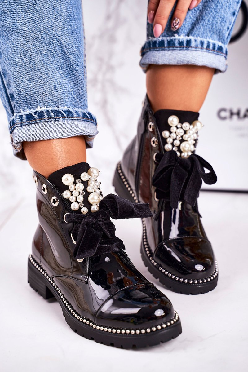 Утеплені чоботи з перлами, шпильками та стрічкою, лакована чорна перла