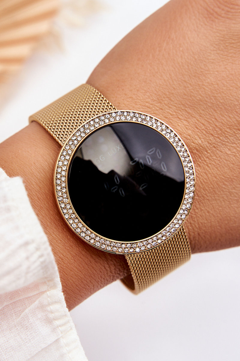 Унікальний цифровий годинник GG LUXE виготовлений з високоякісної нержавіючої сталі. Круглий корпус прикрашений струменями, що імітують циркони. Сітчастий браслет закривається на засувку. Ця модель неодмінно сподобається жінкам, які цінують сучасний і стильний вигляд! До годинника також додається декоративна коробка.