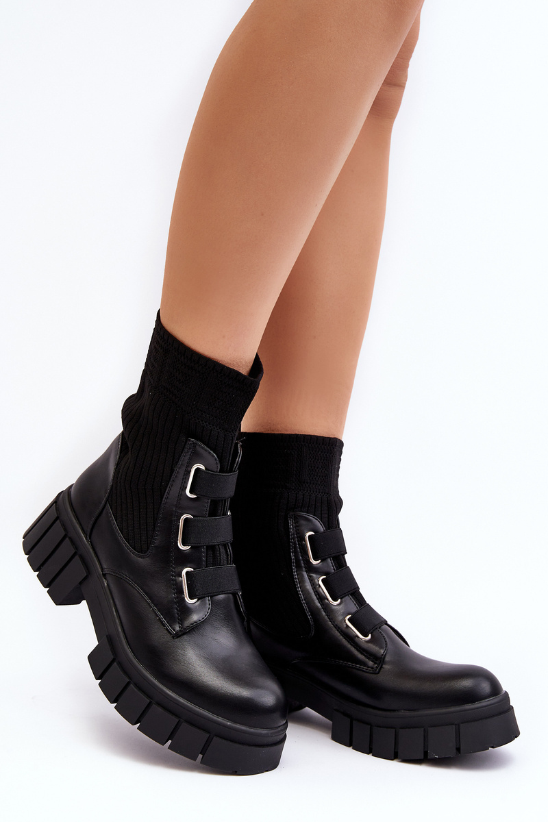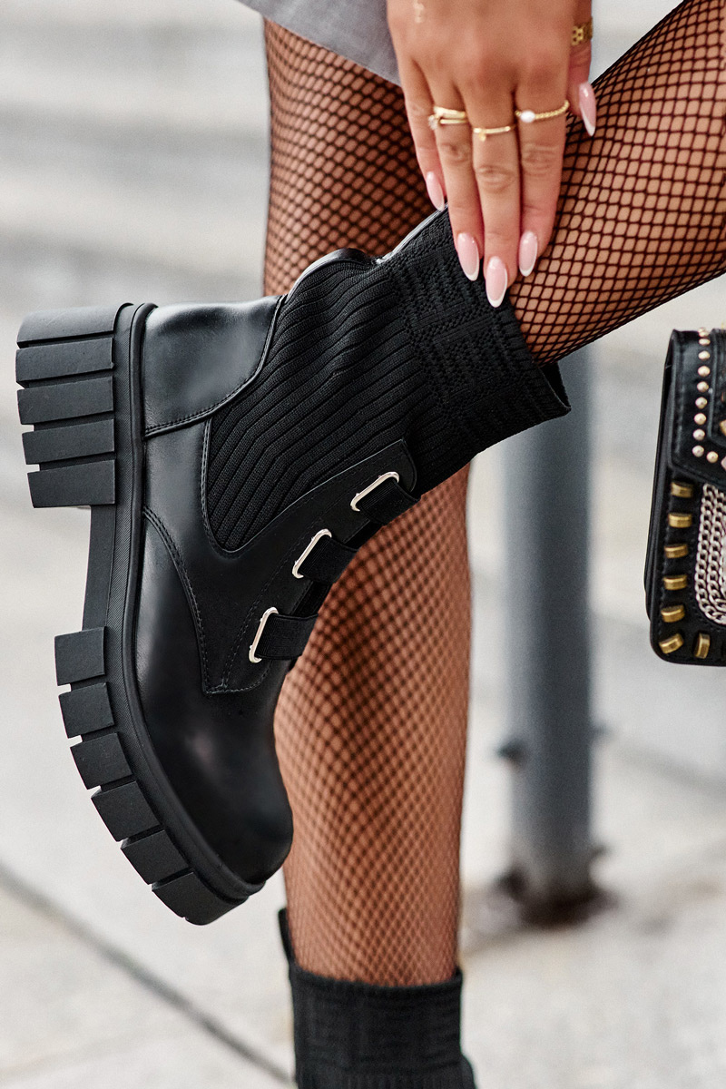 Жіночі ботильйони на плоскому каблуці та платформі. Виготовлений з комбінації еко шкіри та тканини. Модель сліпони з еластичним верхом у вигляді носка. Круглі пальці, посилена п'ята. Ідеально підходить для осіннього вбрання! Вибираючи розмір, орієнтуйтеся на таблицю розмірів.