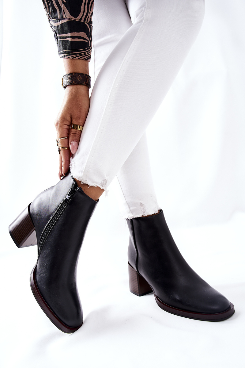 Ботинки з екологічної шкіри. В основі – стійкий каблук на шпильці, який у поєднанні з делікатним утепленням гарантує комфорт на кожному кроці. Легко одягається завдяки вшитій збоку блискавці. Додаткова прикраса у вигляді стрічки на спині.