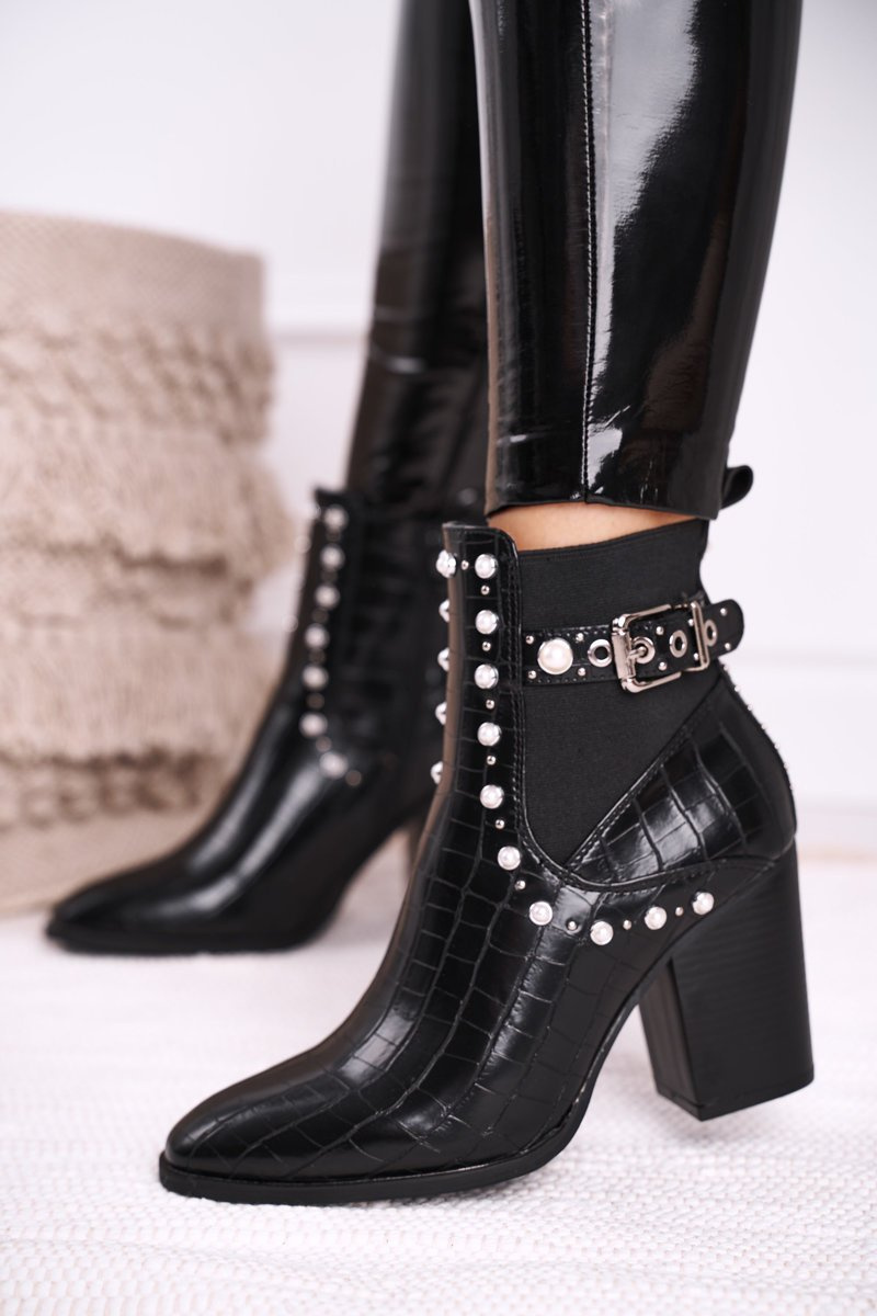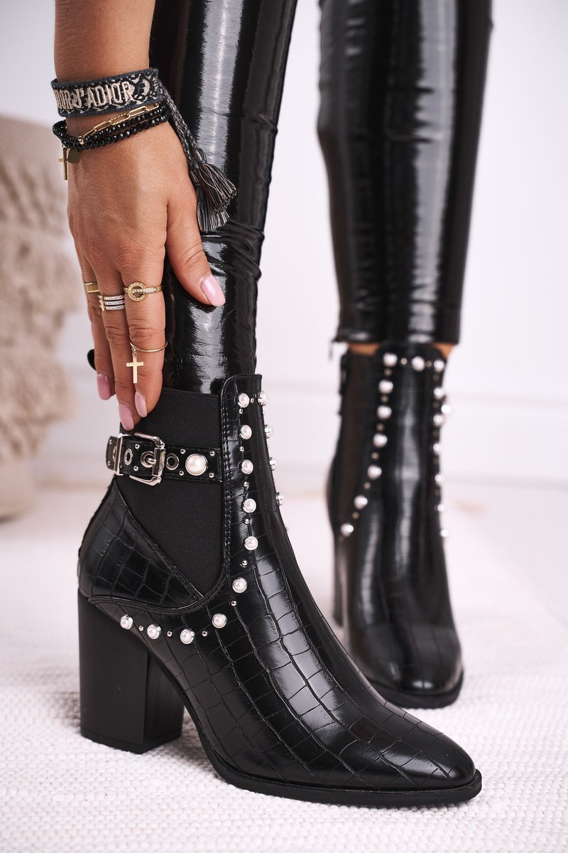 Ексклюзивні жіночі чоботи! Виготовлені з екологічної шкіри, декоровані перлами та пряжкою. Застібається на блискавку. Встановлюється на стійку, яка підніме вашу фігуру. Утеплений ніжною взуттєвою ковдрою. Зробіть собі трохи незвичайного вигляду!