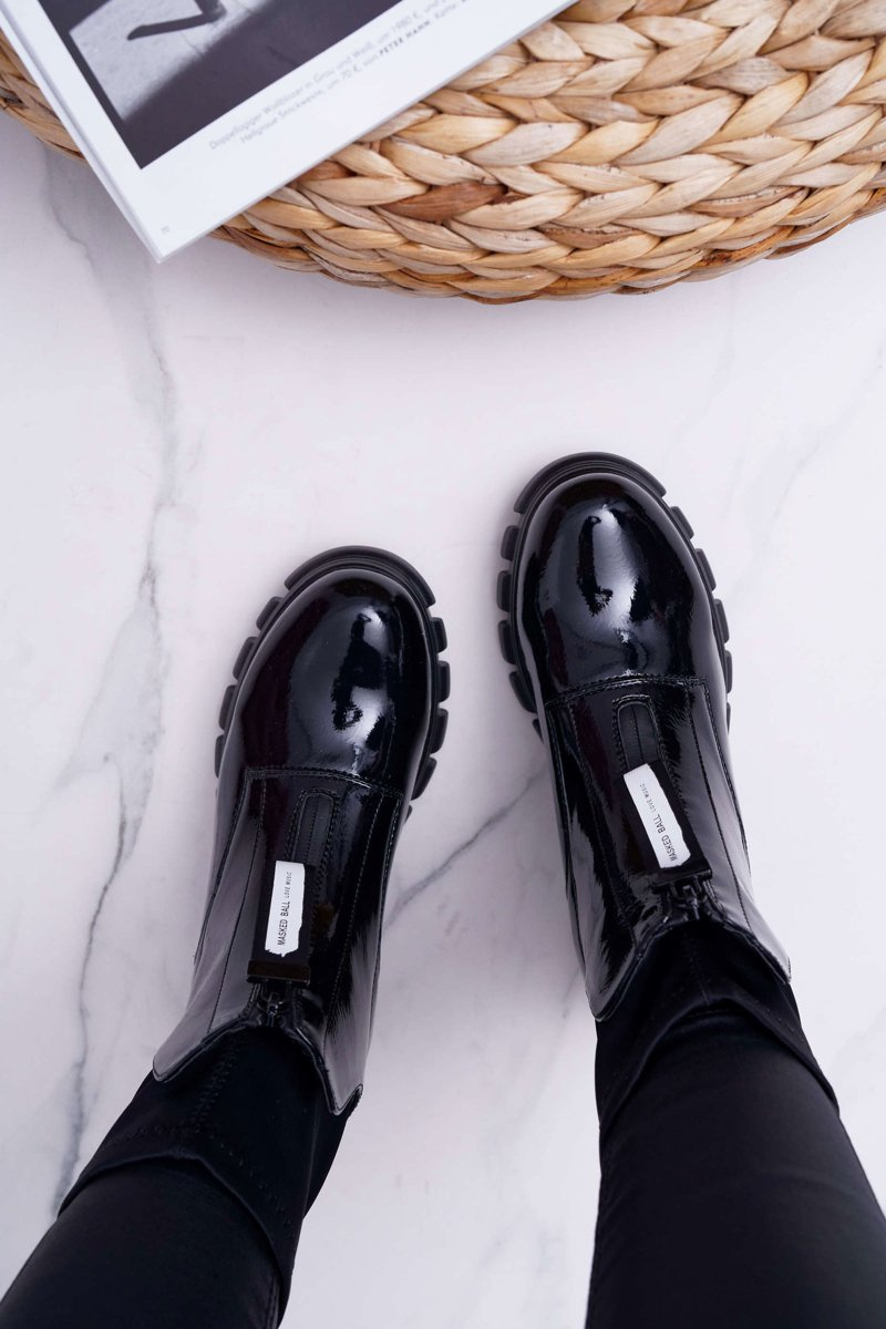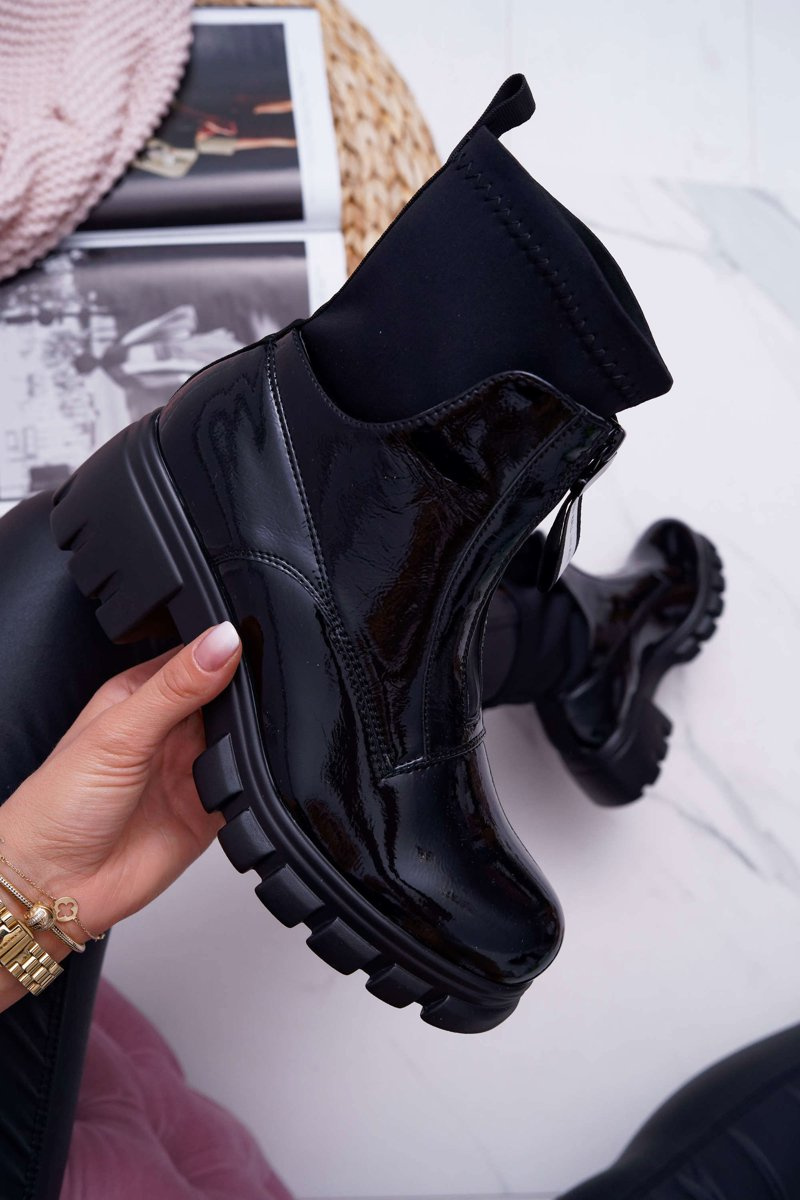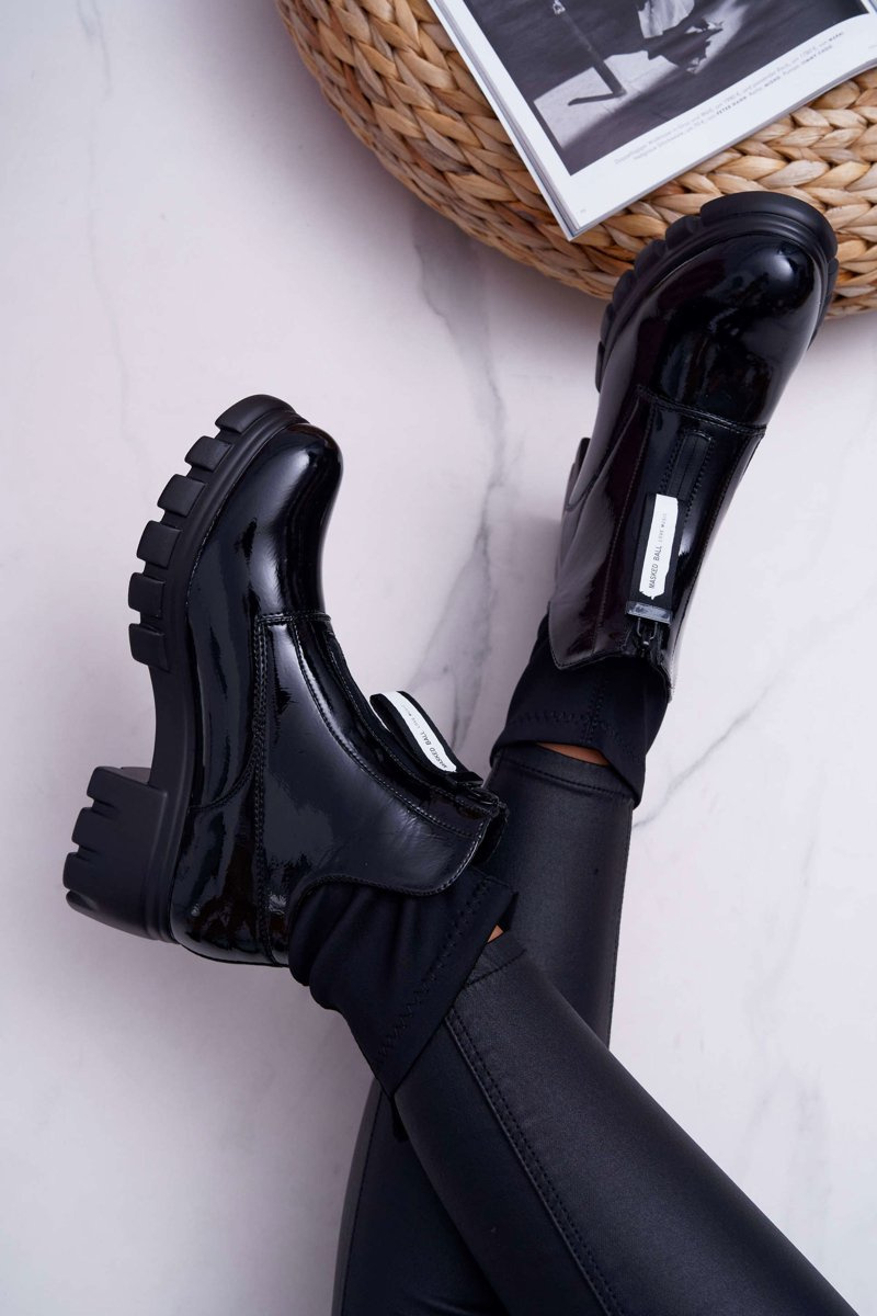 Чоботи Emelia з лакованої екошкіри чорного кольору. Сучасний дизайн в стилі гламур. Слипони, оброблені еластичним «носком». Прикраса у вигляді блискавки з написом підкреслює їх унікальність. Під час вибору розміру пропонуйте таблицю розмірів, яка доступна після наведення курсора або натискання на розмір.