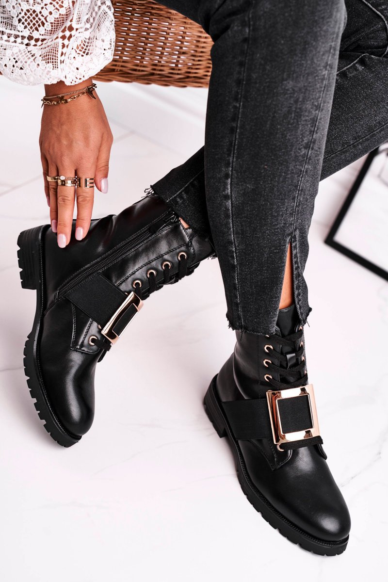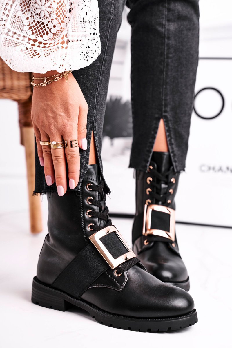 Чоботи жіночі із золотою пряжкою чорні Happy Su