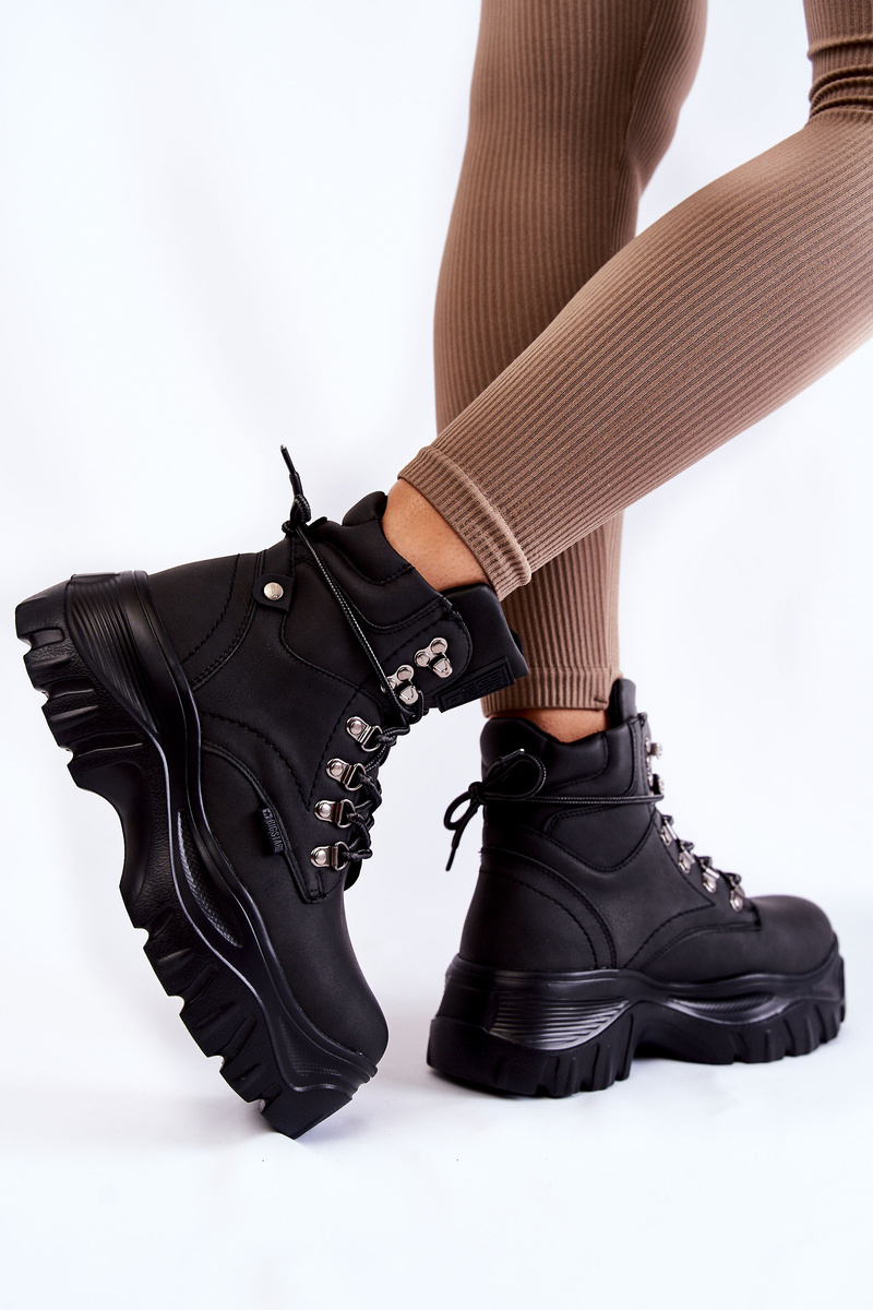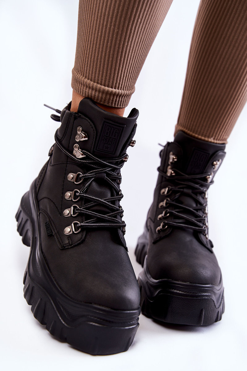 Незвичайні черевики - трапери Big Star виготовлені з еко шкіри. Вони мають устілку Memory Foam System, яка запам'ятовує форму стопи, забезпечує ідеальну посадку, амортизує удари, стійка до деформації та дозволяє випаровувати вологу та регулювати температуру. Масивна підошва і плоский каблук роблять черевики стійкими. Модель з класичною шнурівкою. При виборі розміру скористайтеся таблицею розмірів.