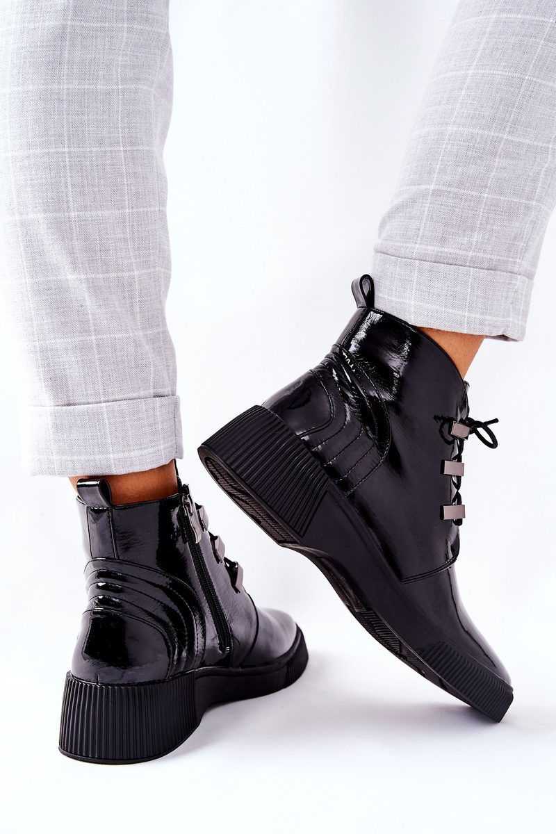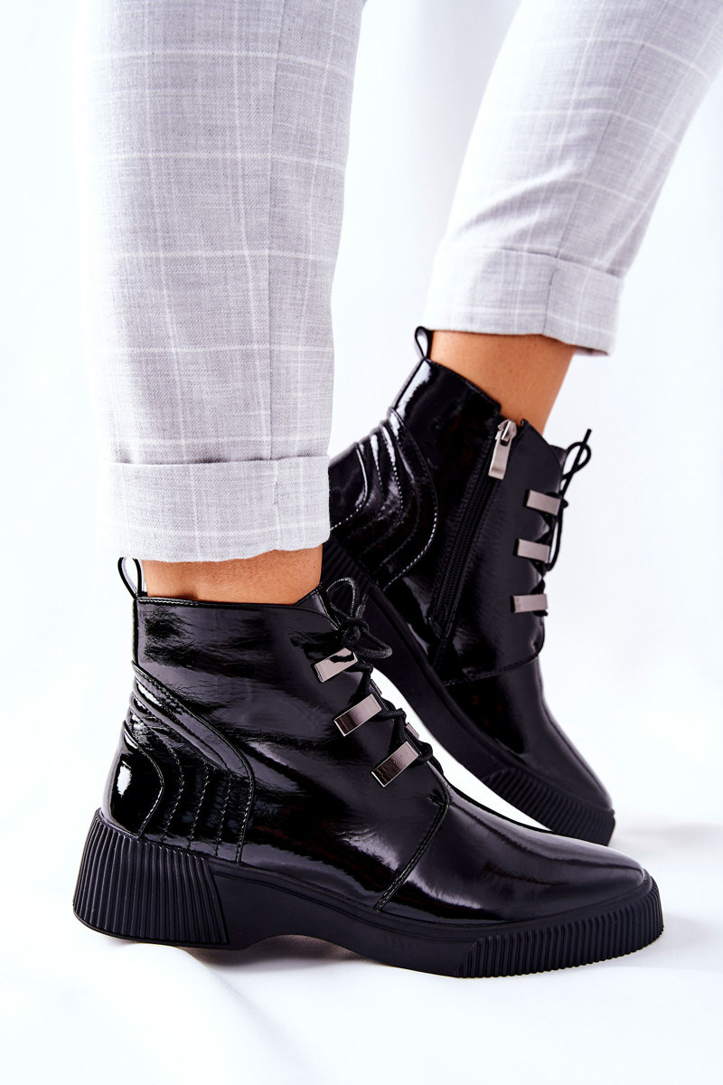 Виняткові черевики з лакованої екологічної шкіри. Черевики мають збоку верхню застібку-блискавку для зручного надягання. Золоті елементи на язику ідеально поєднуються з запатентованими елементами. Зсередини утеплений м'яким хутром. Перегляньте всю нашу колекцію чобіт. Обираючи свій розмір, зверніться до таблиці розмірів