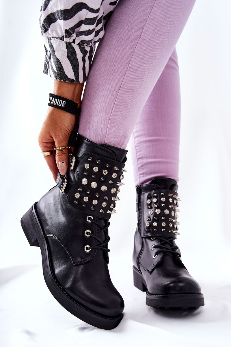 Високі черевики з екологічної шкіри. Вони мають блискавку збоку для зручного надягання. Декоративні шпильки та стрази. Застібка на пряжки підкреслює унікальність цього взуття. Вони також мають прив'язку. Плоский каблук забезпечує стабільність на кожному кроці. Дивіться інші моделі чобіт! Під час вибору розміру зверніться до таблиці розмірів