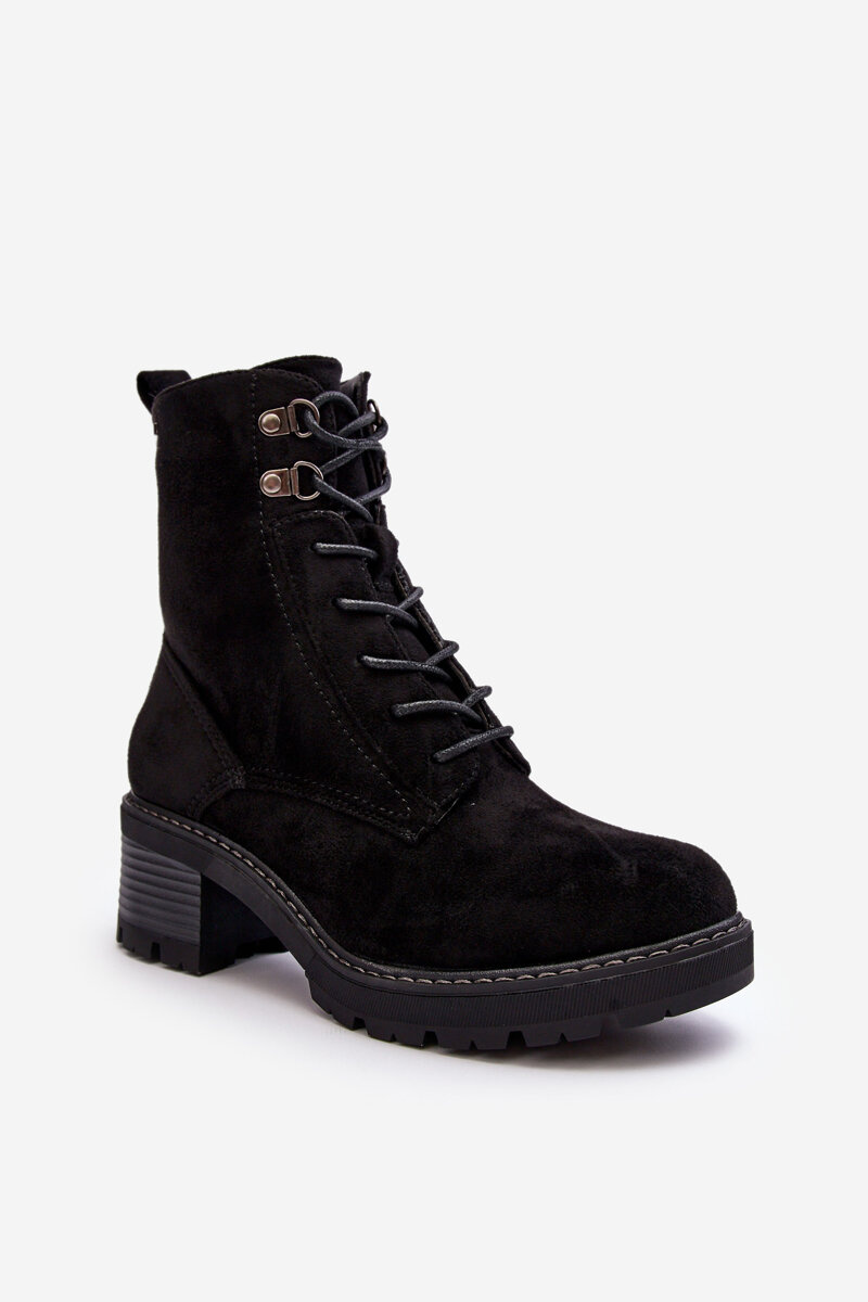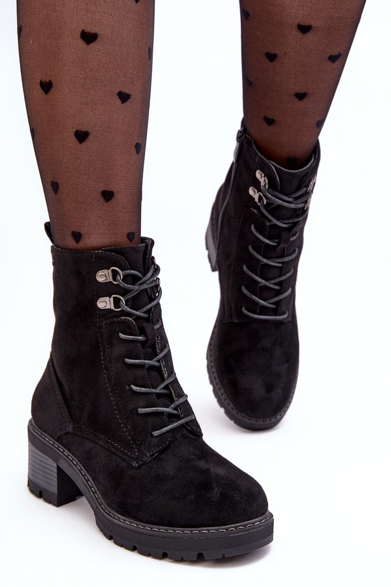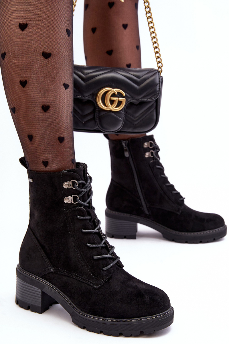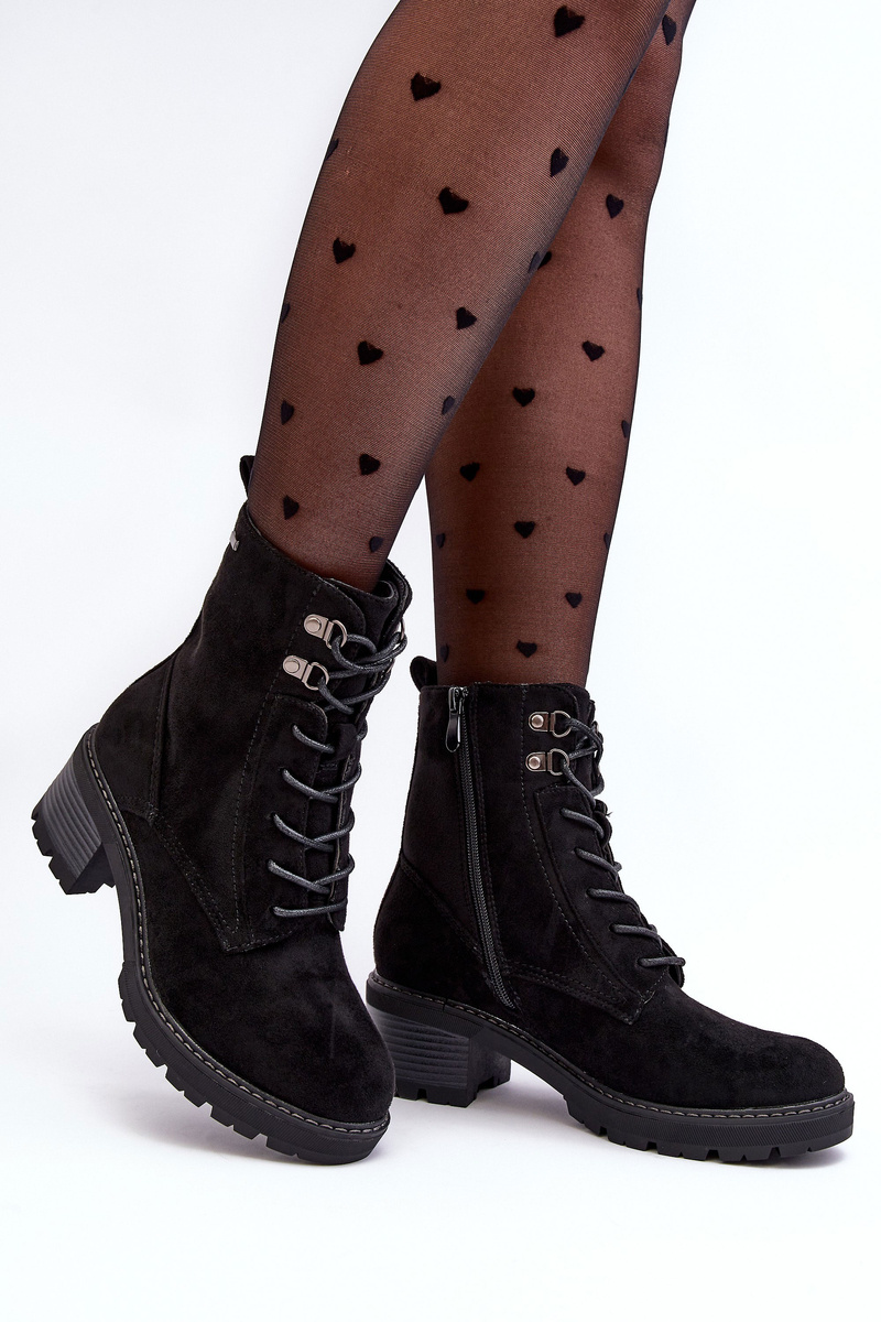Жіночі ботильйони з еко замші. Встановлені на низький стійкий каблук. Верх з боків на блискавці. Шнурівка спереду. Зсередини утеплена взуттєвою ковдрою. Заокруглені пальці. Ця модель стане ідеальним доповненням до осіннього та зимового стилю! Обираючи розмір, орієнтуйтеся на таблицю розмірів.
