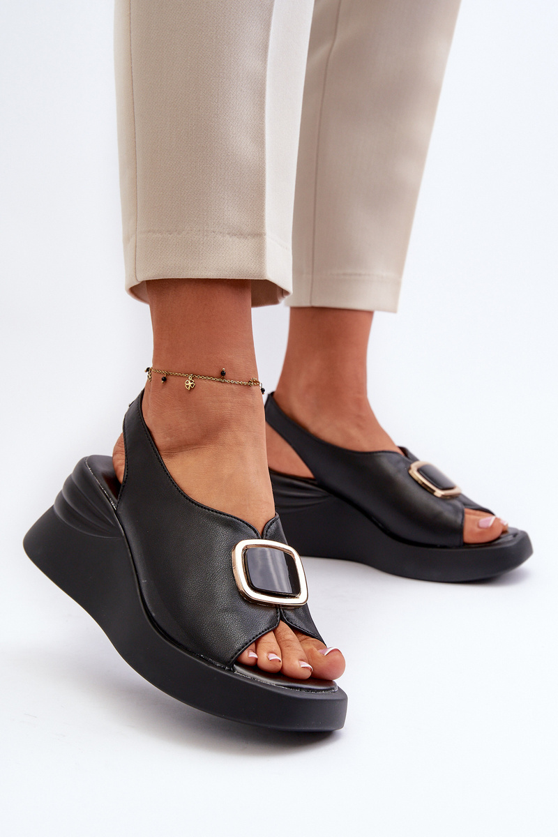 Чорні жіночі шкіряні босоніжки на танкетці з орнаментом Salvania