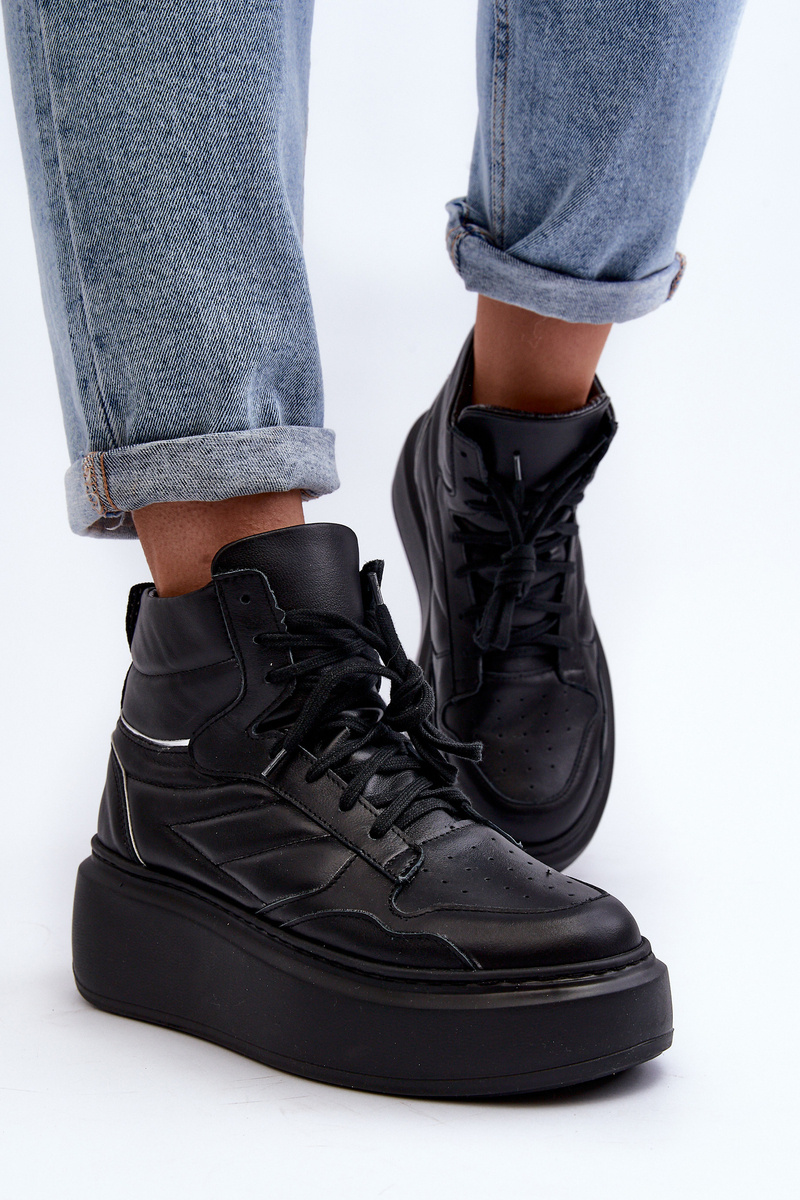Стильне жіноче спортивне взуття з натуральної шкіри. Розташований на масивній платформі. Верх до щиколотки. Заокруглені пальці. Модель з класичною шнурівкою. Ідеальний варіант для весняних днів! Цей стиль вам точно сподобається! Обираючи розмір, орієнтуйтеся на таблицю розмірів.
