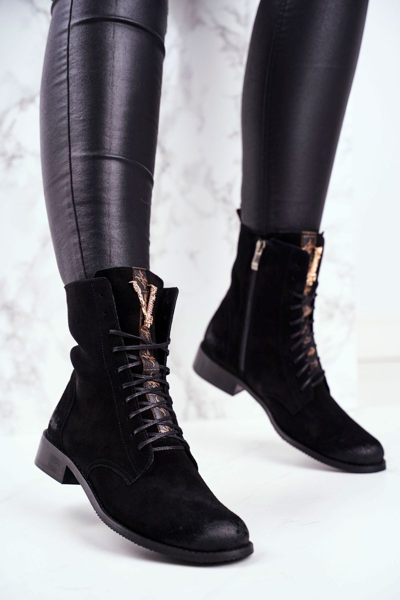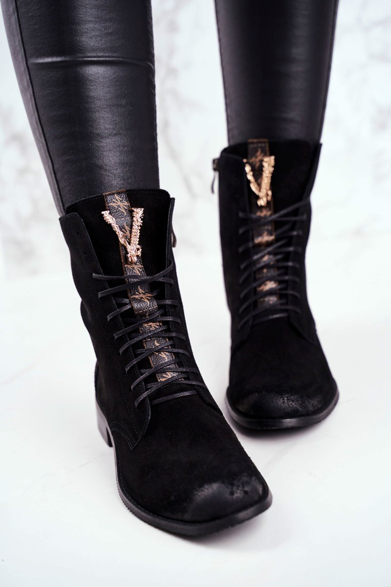 Черевики - це не тільки взуття для холодних днів. Вони також чудово підходять для створення весняних стилізацій. Взуття виготовлене з натуральної шкіри нубук. Орнамент у вигляді золотої літери V виглядає красиво і підкреслює їх стиль. Застібку-блискавку, вшиту збоку, буде легше надіти, а шнурки забезпечать кращу посадку. Черевики на тонкому плоскому каблуці. При виборі розміру скористайтеся таблицею розмірів.