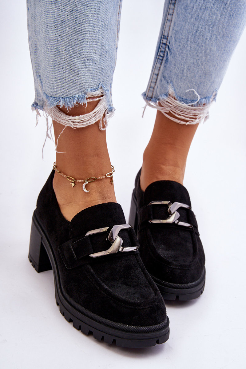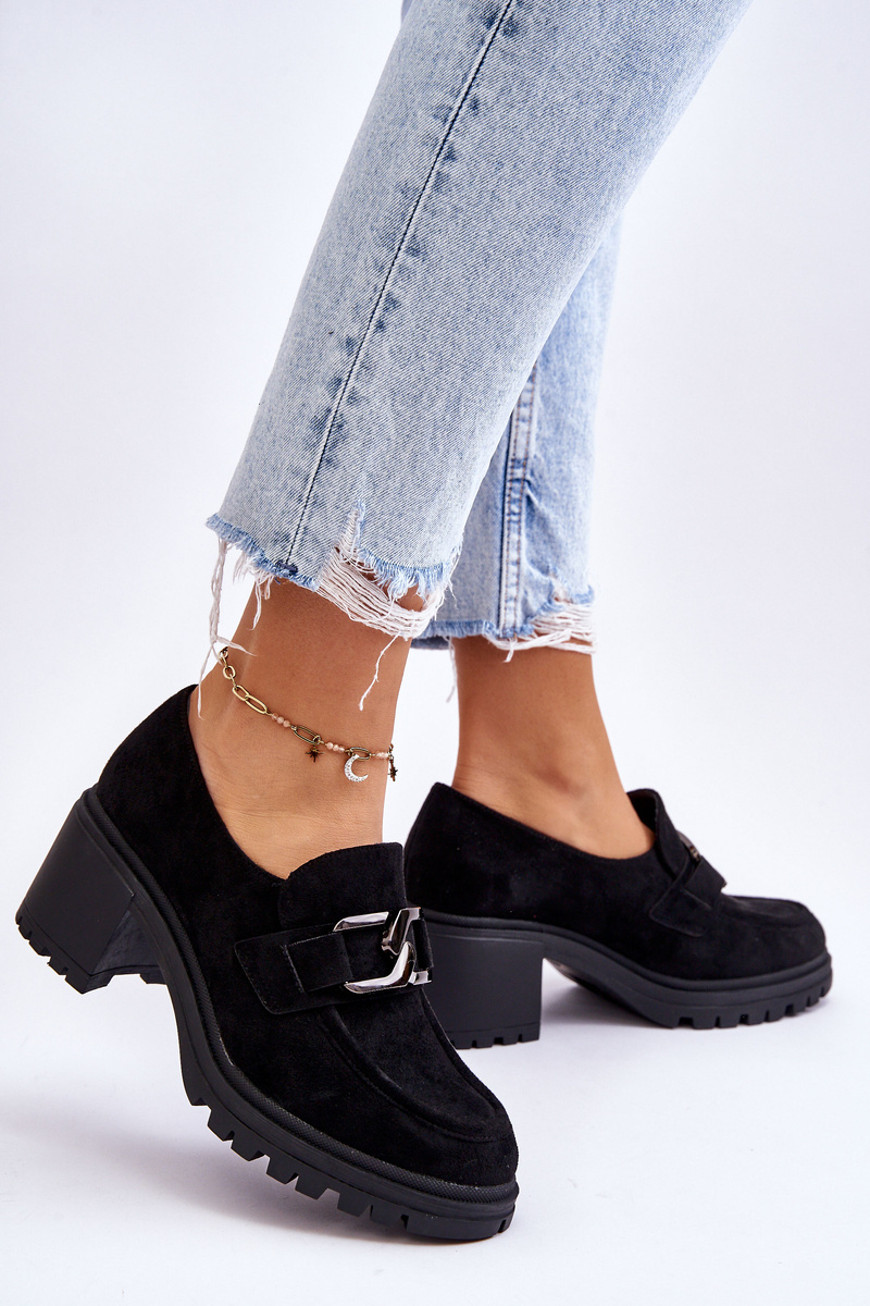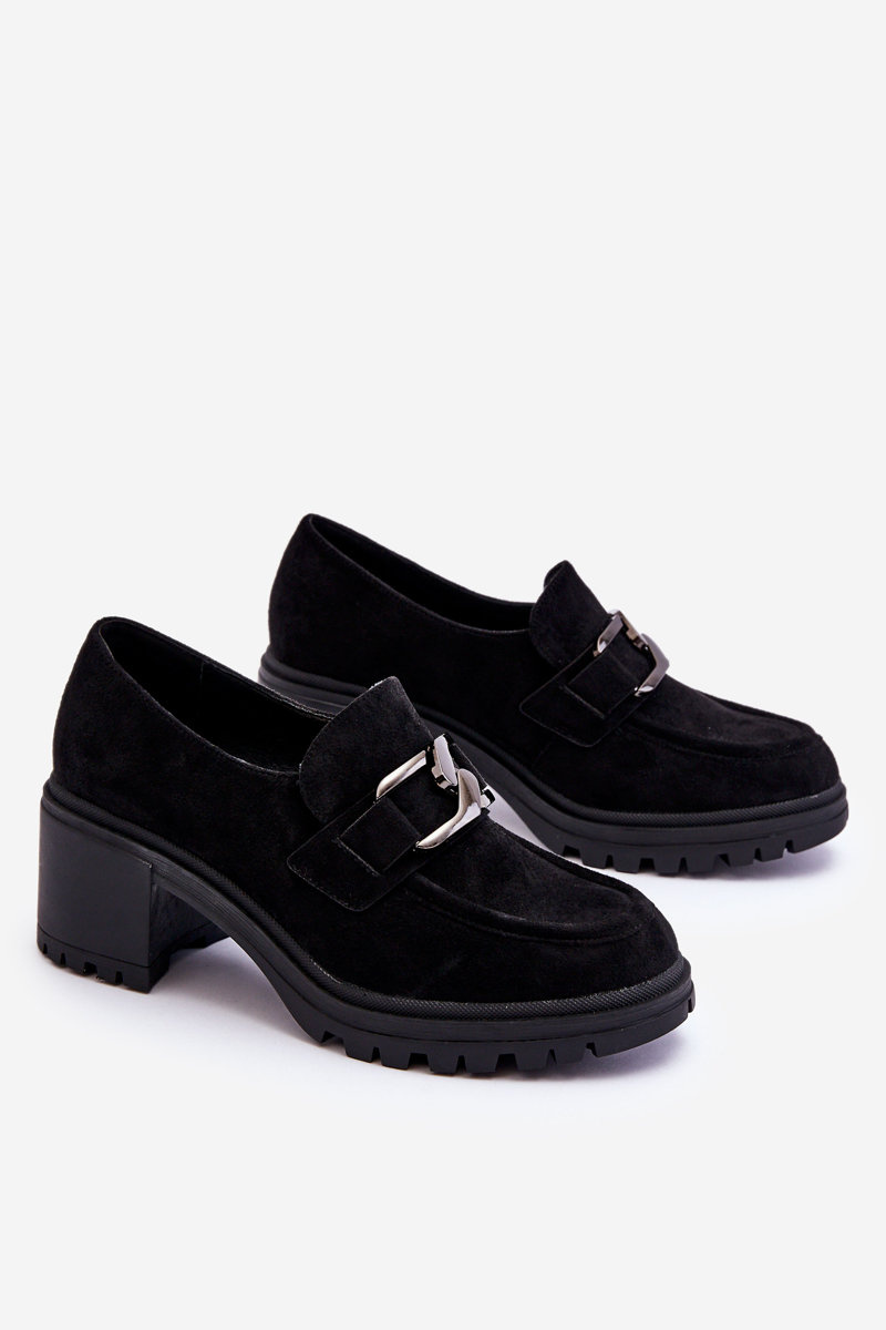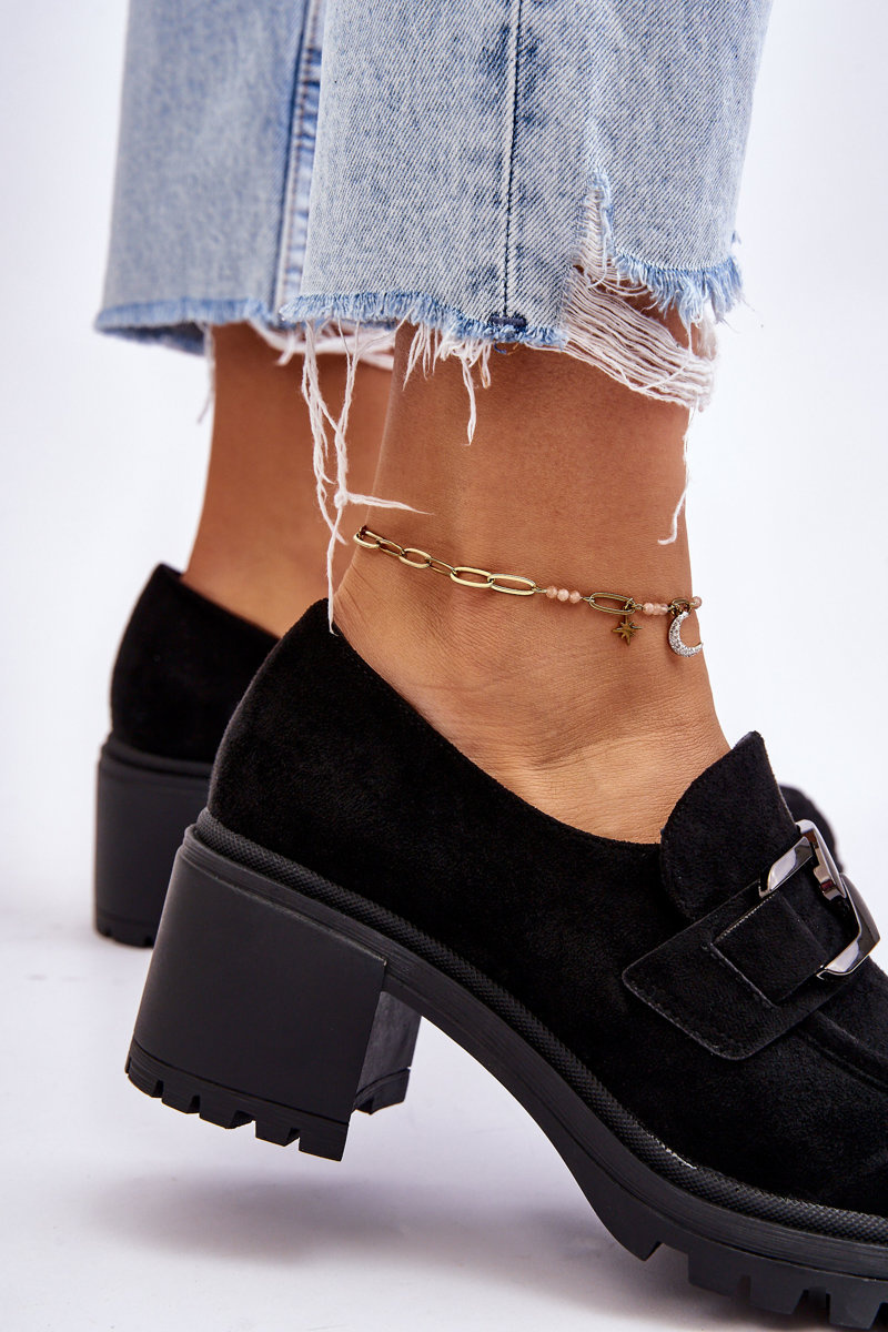 Модні жіночі туфлі встановлені на масивному, стійкому каблуці у вигляді невисокого каблука. Виготовлений з якісної замшевої екологічної шкіри. Спереду мають пластикові прикраси. Підошва з канавками відмінно ізолює від нерівностей, холодної землі. Зручна устілка виготовлена з натуральної шкіри. Обираючи розмір, орієнтуйтеся на таблицю розмірів.