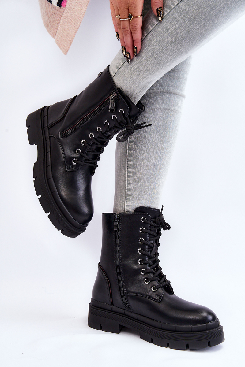 Класичні жіночі черевики з еко шкіри. Модель має міцну шнурівку і застібку-блискавку. Крім того, зовні є декоративна блискавка. Чоботи мали плаский каблук і підошву з протектором. Каблук посилений. Трапери не мають ізоляції. Ця класична модель повинна бути у вашому гардеробі! Обираючи розмір, зверніться до таблиці розмірів.