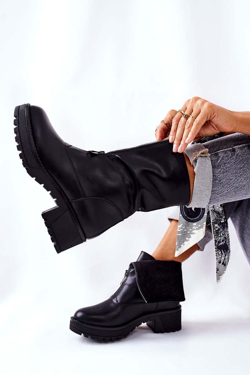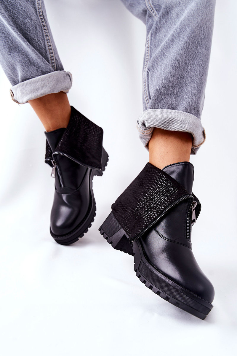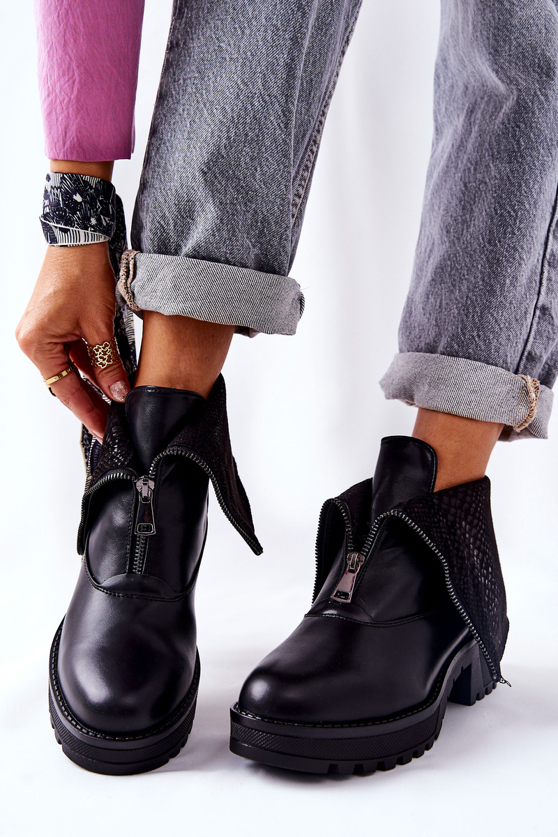 Ботильони з еко шкіри. Вони мають блискавку на передній частині верху, що робить їх зручними в носінні. Верх згорнутий. Приємна на дотик ковдра для взуття стане в нагоді в холодні осінні дні. Масивна плоска п'ята забезпечує стійкість і комфорт у використанні. Під час вибору розміру радимо використовувати таблицю розмірів.