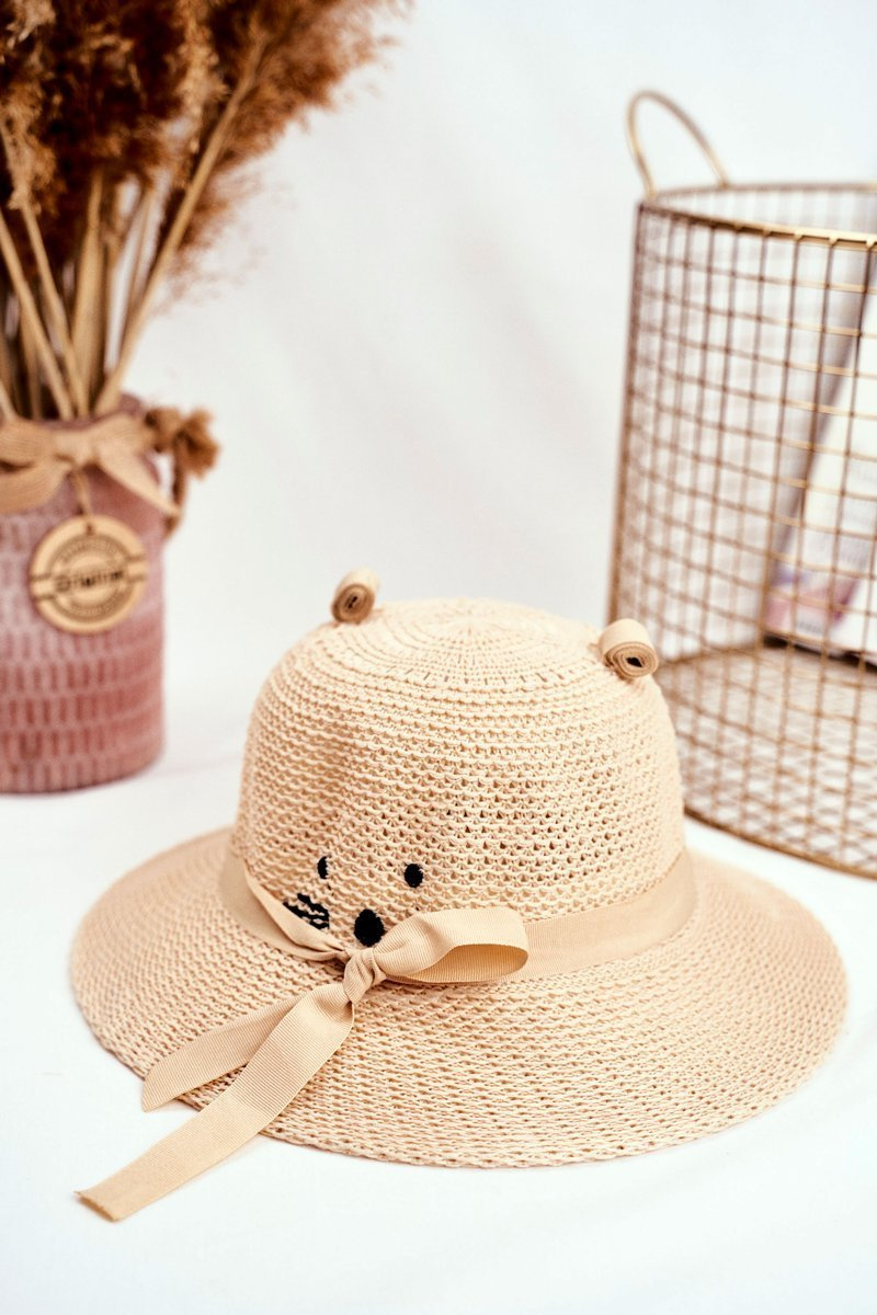 Легка і модна дитяча шапка зі 100% поліестеру. Край прикрашений бежевою стрічкою. Шапочка має гумку для одягання під підборіддя. Обов’язково перегляньте всю нашу колекцію головних уборів!