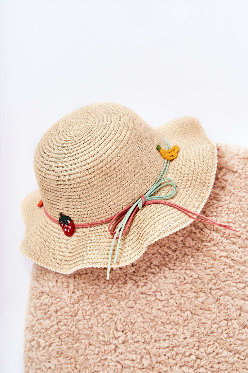 Легка дитяча шапочка в двоколірну ажурну смужку. Крім того, на поясі є милі підвіски з фруктовим мотивом. Полі капелюха хвилясті. Всередині є шнурок, який дозволяє регулювати шапку. Виріб виготовлено з 100% паперу. Обов’язково перегляньте всю нашу колекцію головних уборів!