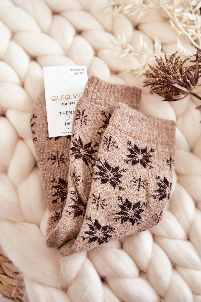 Теплі жіночі шкарпетки виготовляються переважно з вовни. Ідеально підходить для холодних зимових днів. На них візерунки сніжинок. Делікатний рант ідеально підійде до ширини ноги. Ці термоактивні шкарпетки ідеально підходять для будь-якої застуди!