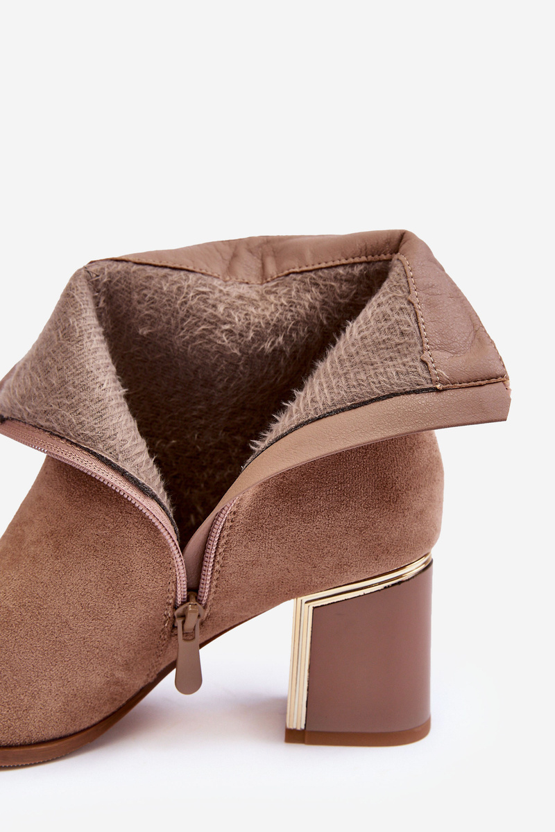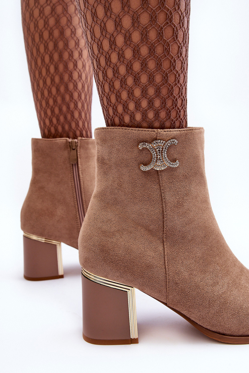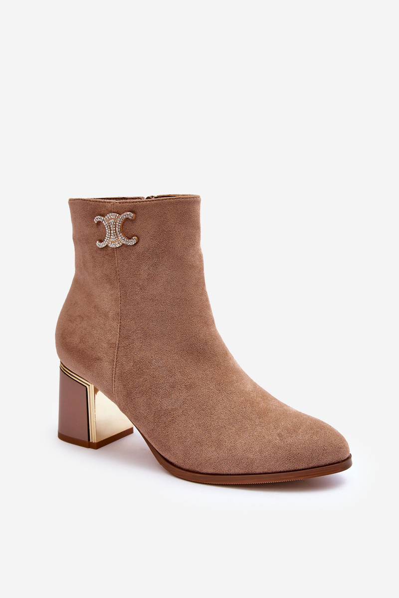 Жіночі ботильйони. Виготовлений з м'якої на дотик еко замші. Встановлюється на стійкий каблук. Застібається на блискавку з внутрішньої сторони. На п'яті є дзеркальний елемент і ювелірна прикраса на верхній частині штанини. Носок посилений, зсередини утеплений підкладкою. При виборі розміру орієнтуйтеся на таблицю розмірів.