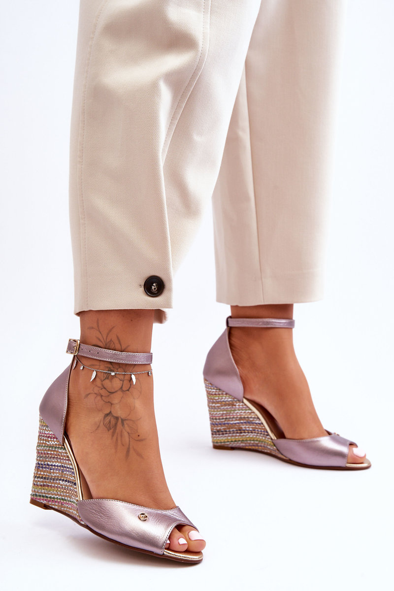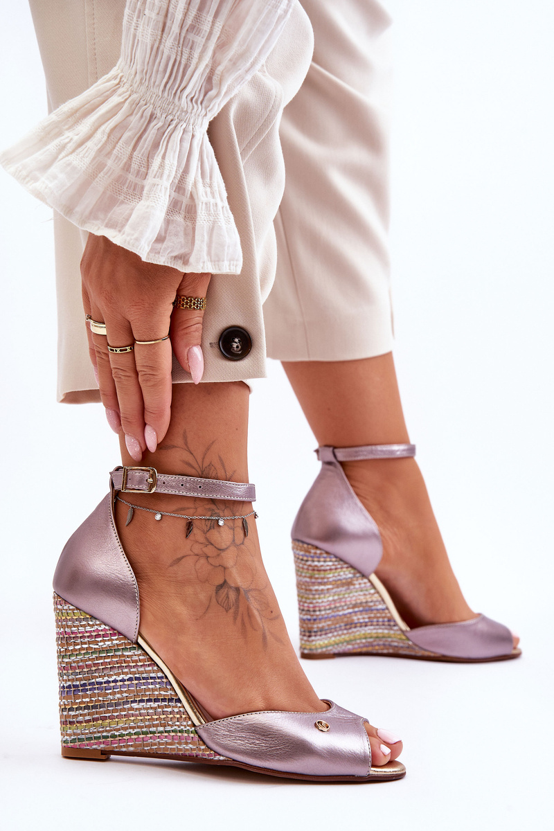 Жіночі босоніжки виготовлені з натуральної шкіри. Мають стійку, декоративну танкетку з тасьмою. М'яка устілка виготовлена ​​з натуральної шкіри і забезпечить комфорт під час використання. Ця модель застібається на щиколотку за допомогою регульованого ремінця з пряжкою. Взуття чудово підходить для багатьох випадків. Обираючи розмір, орієнтуйтеся на таблицю розмірів.