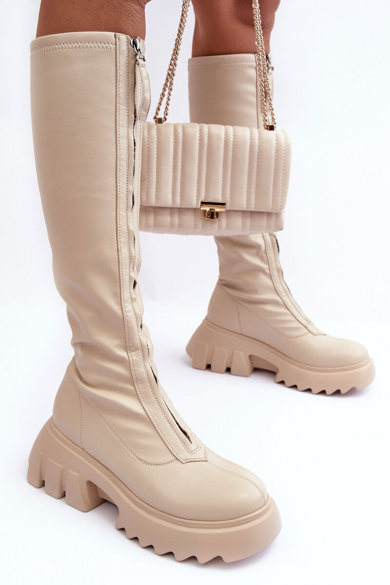 Модні жіночі чоботи до коліна. Виготовлена з еко шкіри. Комплект на масивній платформі і плоскому каблуці. Модель застібається на блискавку, яка проходить по всій довжині верху спереду. Носок жорсткий, кінчики закруглені. Внутрішня частина обшита підкладкою для взуття. Вибираючи розмір, орієнтуйтеся на таблицю розмірів.