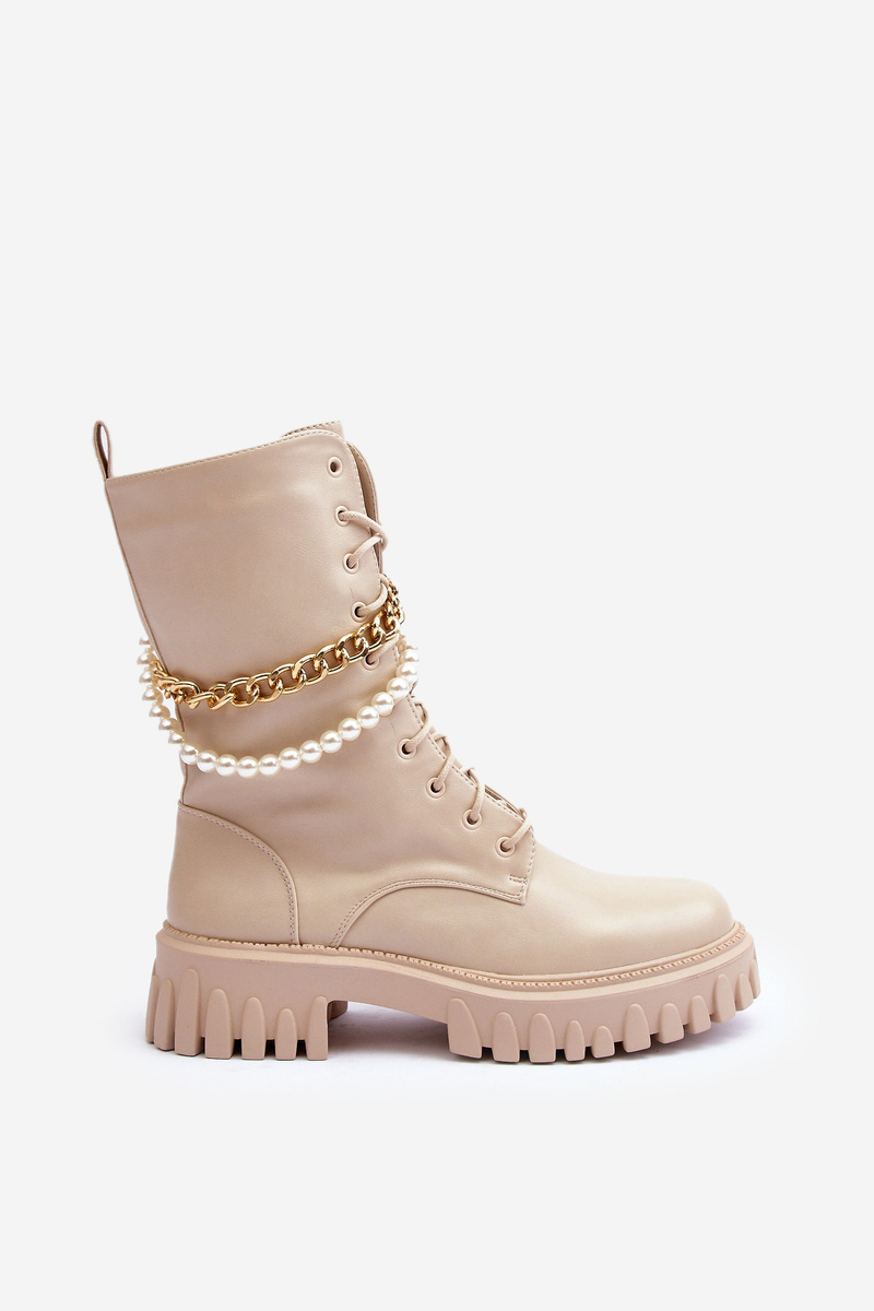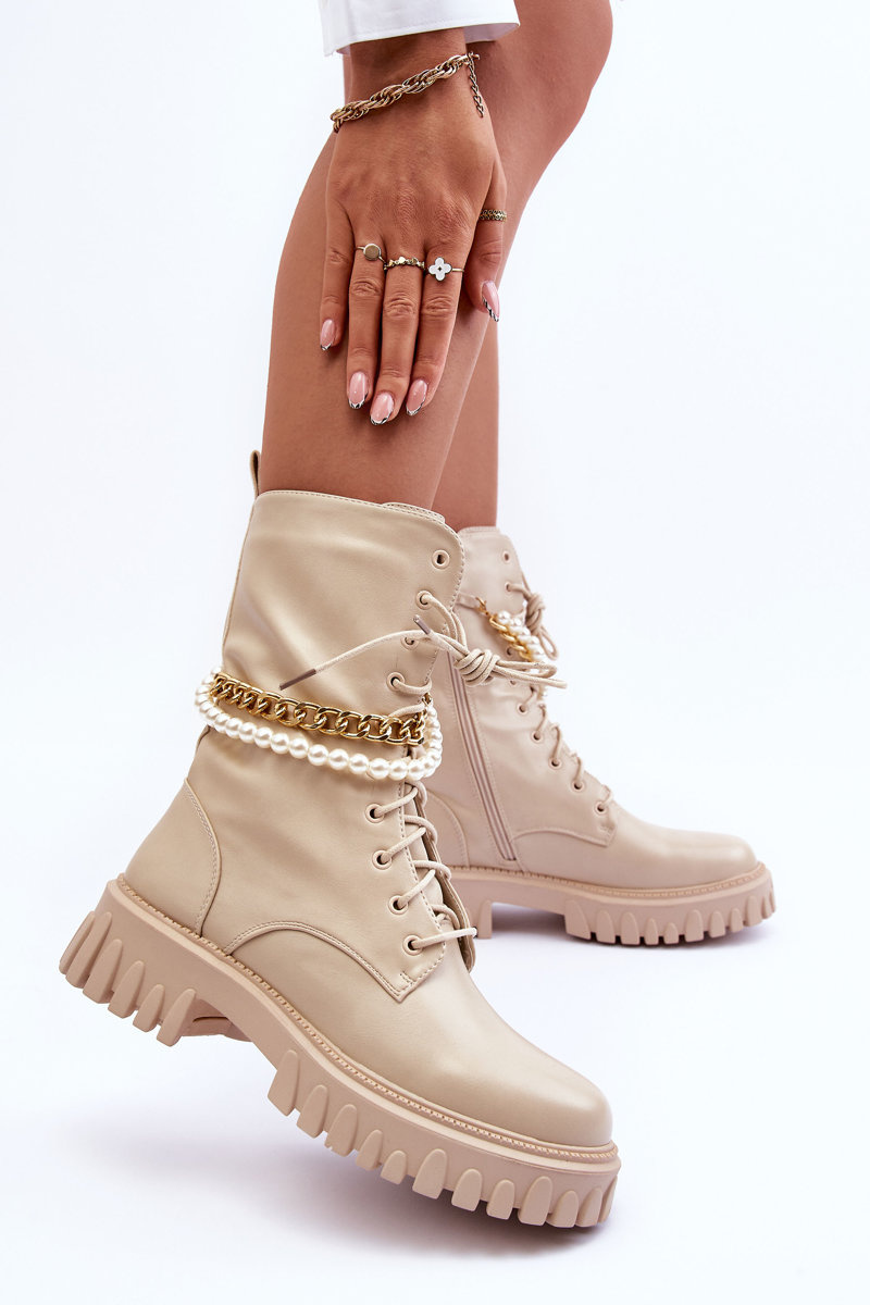 Модні жіночі ботильйони з еко шкіри. Ця модель має застібку-блискавку та додаткову шнурівку, що дозволяє правильно підігнати штанину до товщини ноги. Крім того, носок цього взуття посилений. Взуття має ланцюжок і штучні перли, які можна від'єднати. Не вагайтеся та купуйте сьогодні! Вибираючи розмір, орієнтуйтеся на таблицю розмірів.