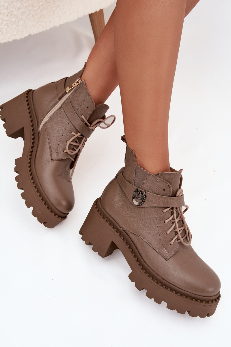 Шкіряні жіночі ботильйони на каблуці з оздоблювальним ремінцем з підкладкою Zazoo 60557 темно-бежеві