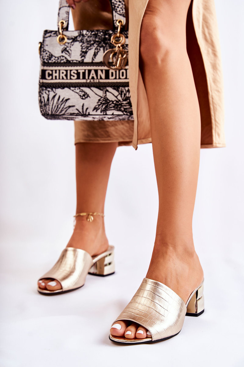 Шкіряні жіночі тапочки Крокодиловий візерунок На Каблуку Gold Perry