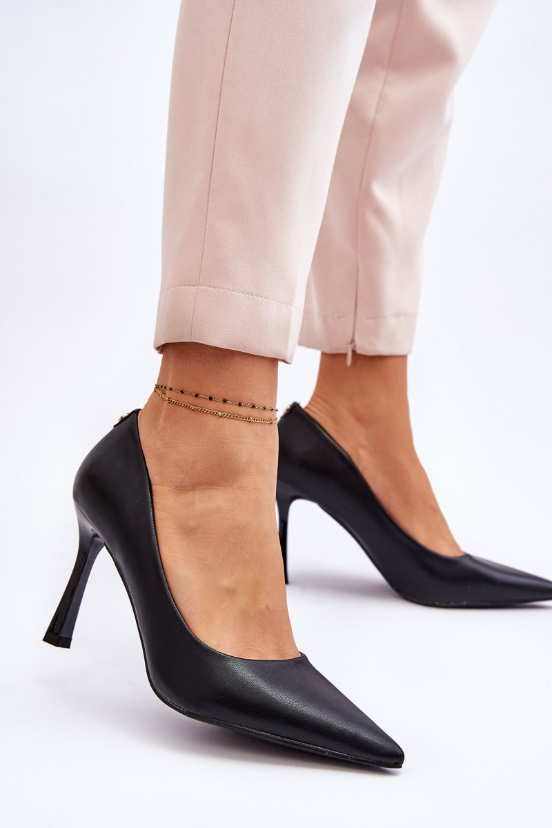 Класичні, але в той же час модні шпильки виготовлені з еко шкіри. Ця модель має загострений ніс. М'яка устілка гарантує комфорт під час використання. Човники були на звуженому догори каблуці. Каблук у цьому взутті посилений, що забезпечує правильну стабілізацію стопи. Вибираючи розмір, зверніться до таблиці розмірів.