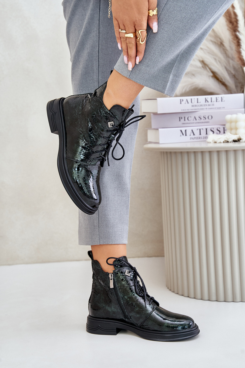 Шкіряні лаковані ботильйони жіночі утеплені на блискавку D&A LZ42-042 Темно-зелений