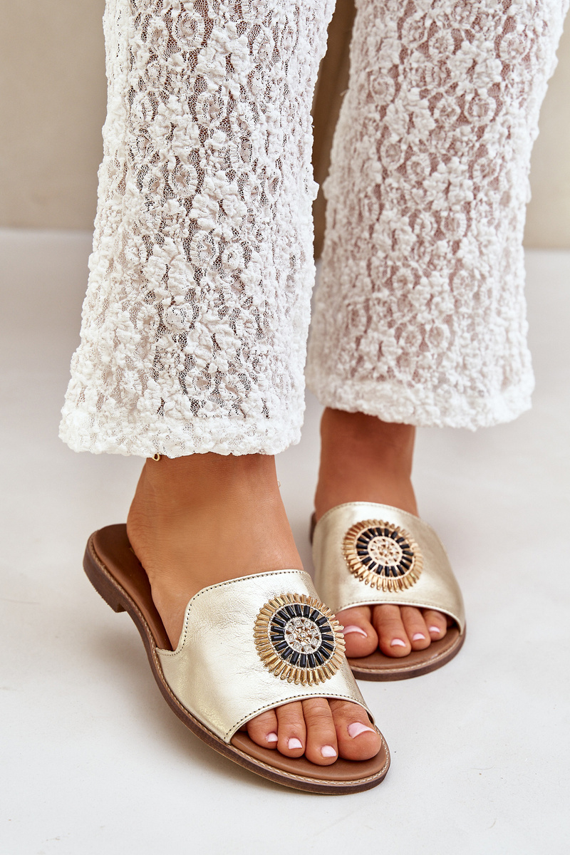 Шкіряні сандалі з прикрасою на плоскому каблуці Zazoo 3047/O золоті