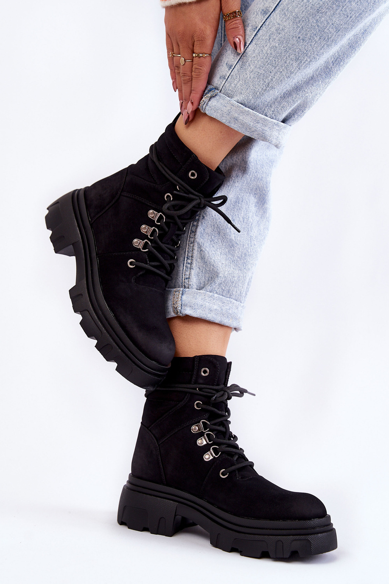 Класичні жіночі чоботи мають шнурівку. Модель виконана з еко шкіри. Крім того, ці черевики мають посилений каблук. Вони кріпляться на масивну плоску п'яту з канавками. Верх з відстрочкою. Закруглений, жорсткий палець. Ці чоботи підійдуть у багатьох стилях, тому ви повинні мати їх у своєму гардеробі! При виборі розміру скористайтеся таблицею розмірів.